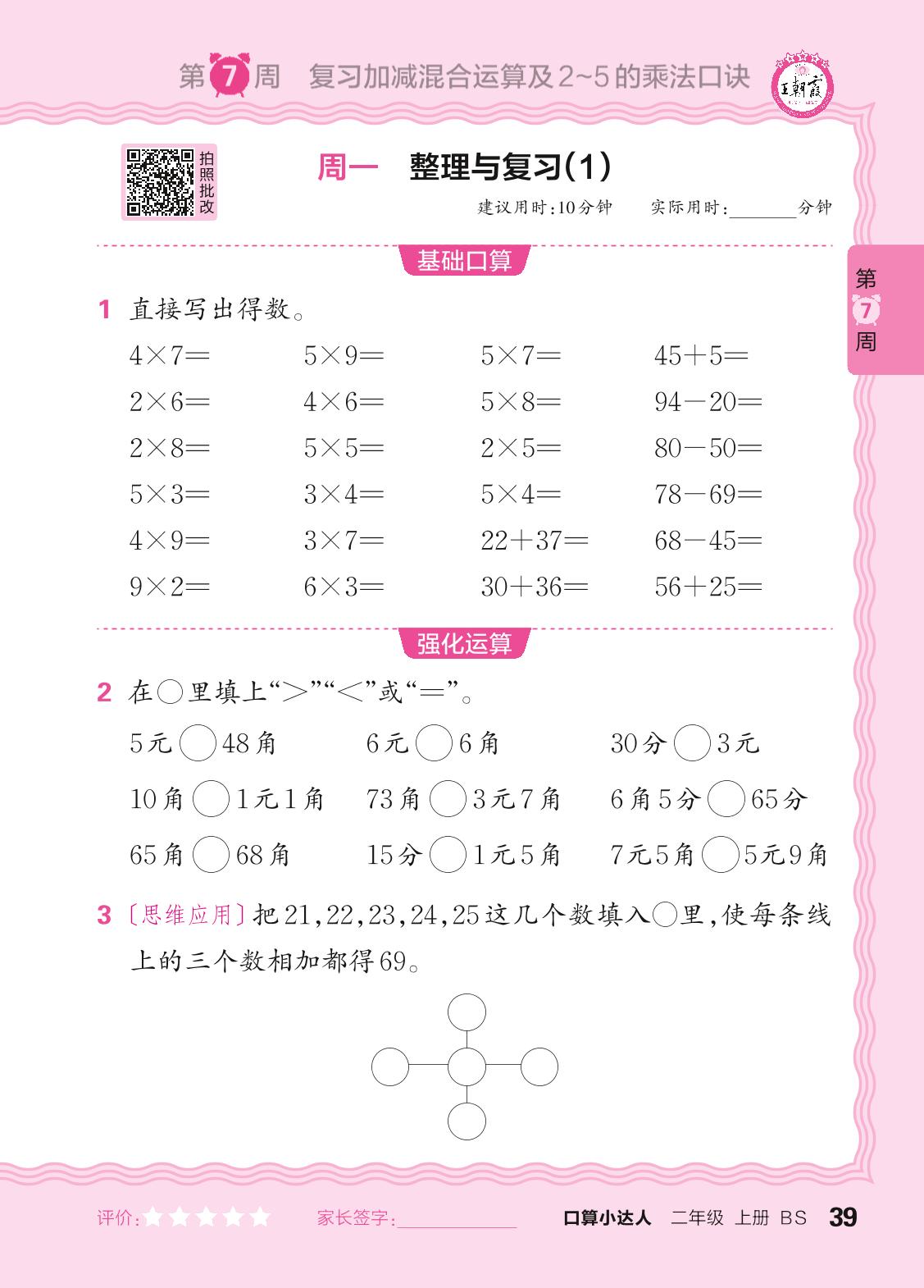 2024秋上册二年级数学北师版 口算计算专练 第7周