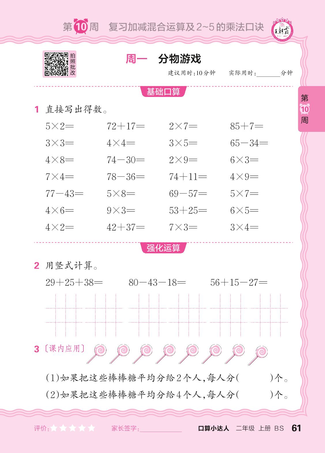 2024秋上册二年级数学北师版 口算计算专练 第10周