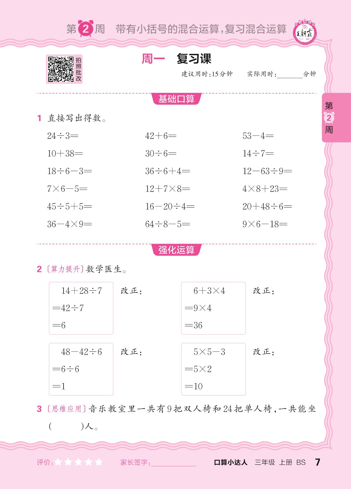 2024秋上册三年级数学北师版 口算计算专练 第2周