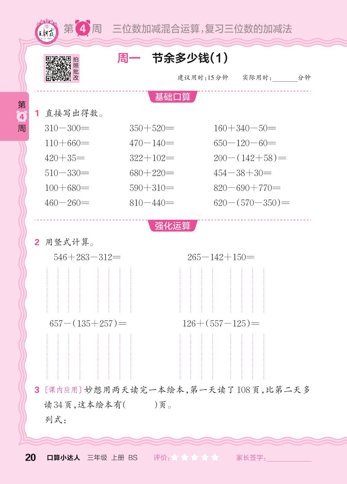 2024秋上册三年级数学北师版 口算计算专练 第4周