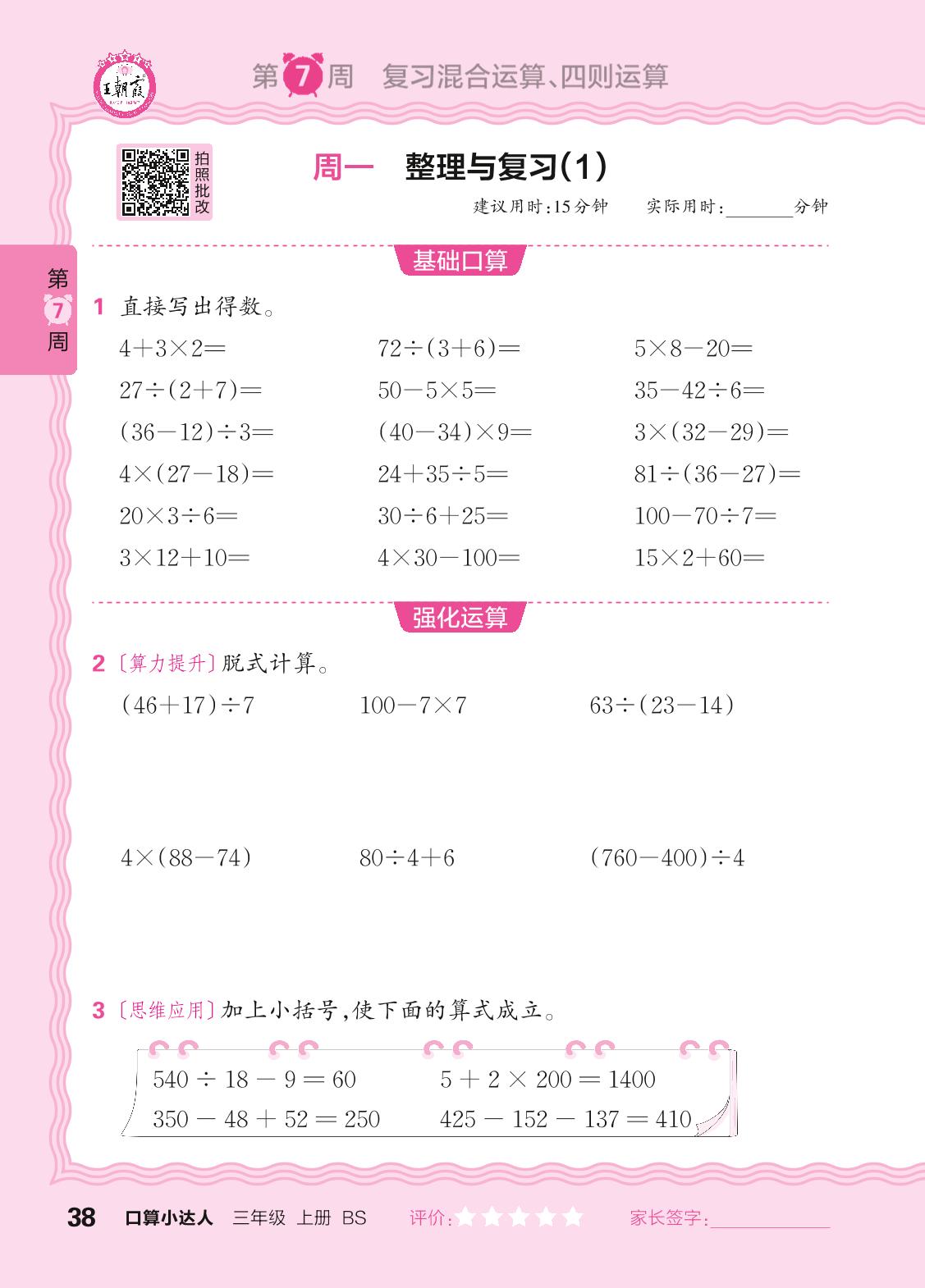 2024秋上册三年级数学北师版 口算计算专练 第7周