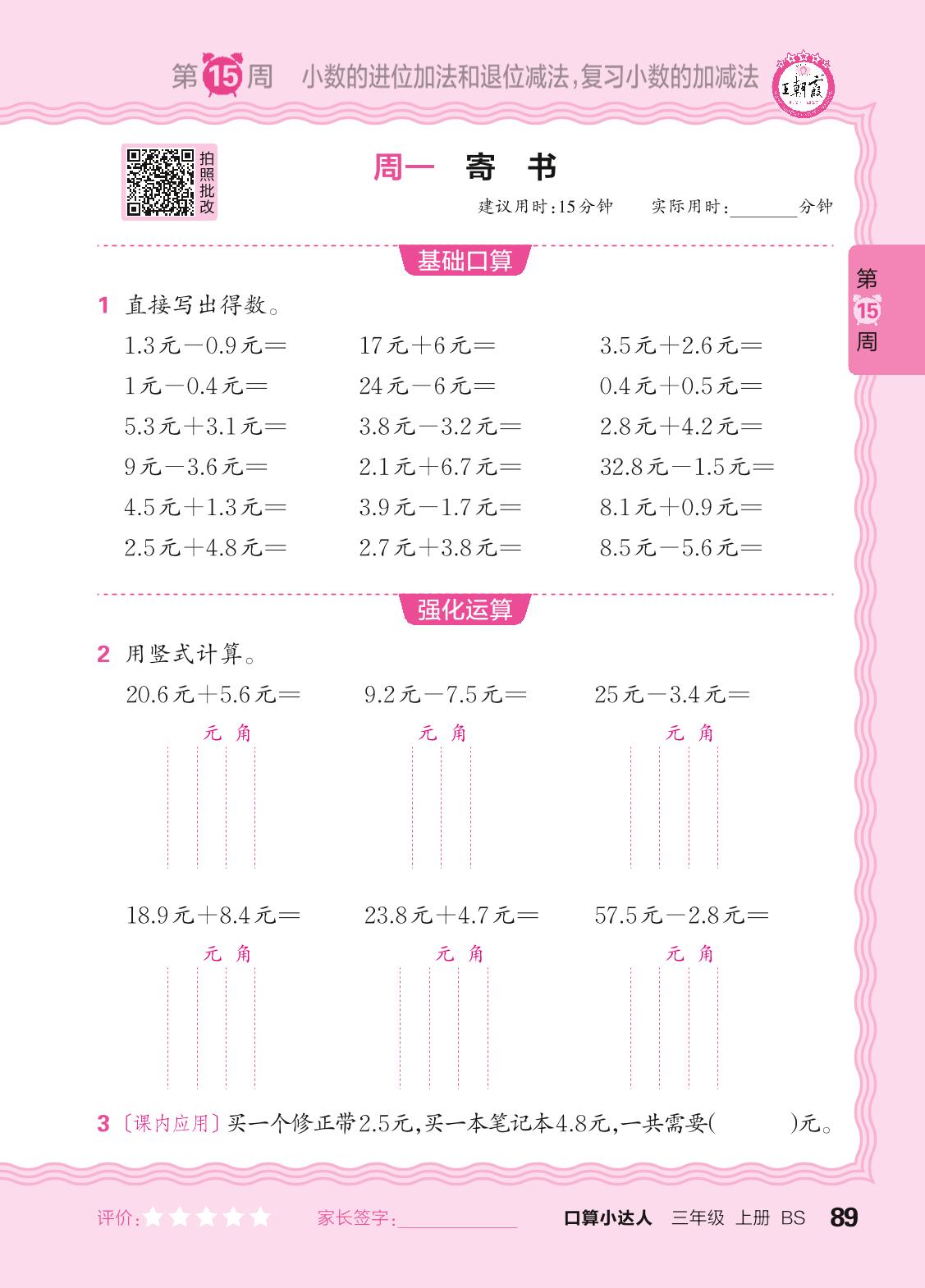 2024秋上册三年级数学北师版 口算计算专练 第15周