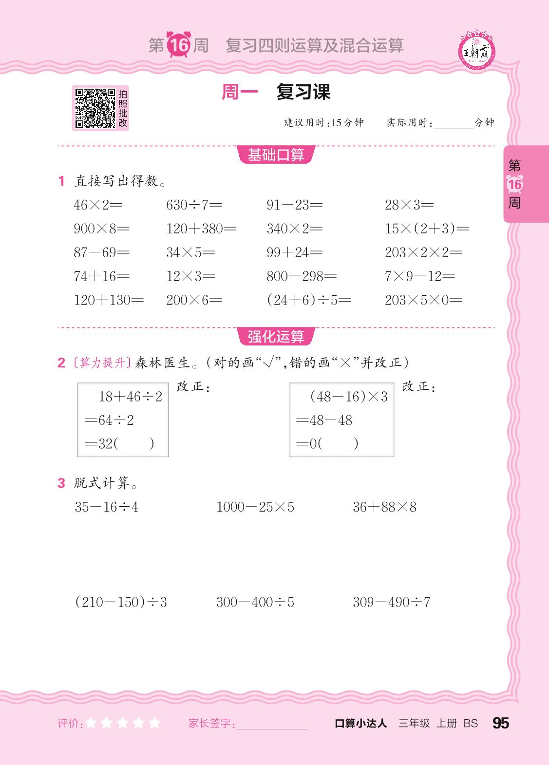 2024秋上册三年级数学北师版 口算计算专练 第16周