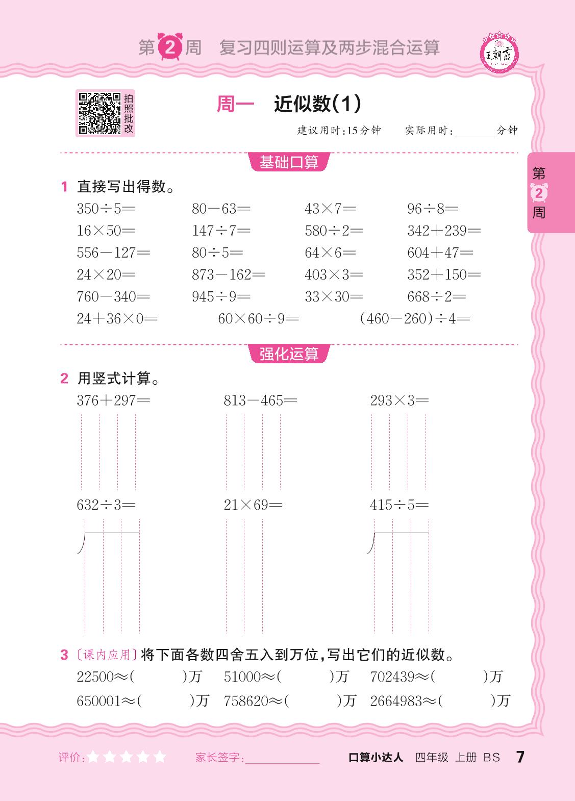 2024秋上册四年级数学北师版 口算计算专练 第2周