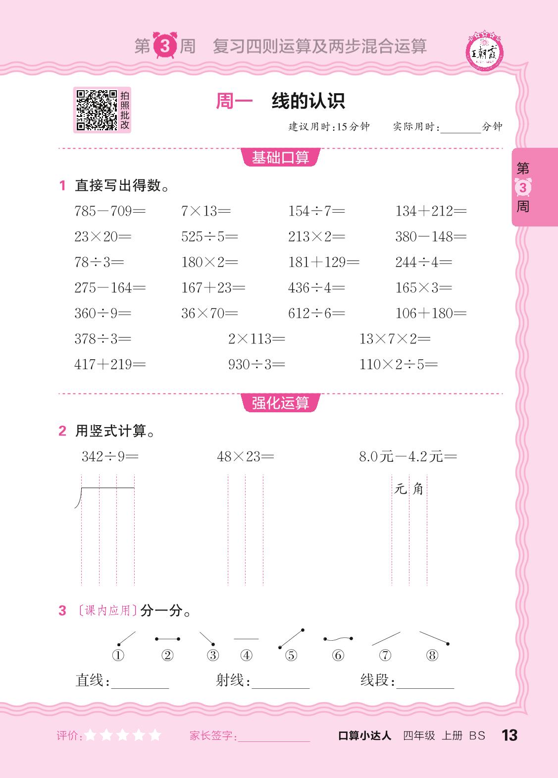 2024秋上册四年级数学北师版 口算计算专练 第3周
