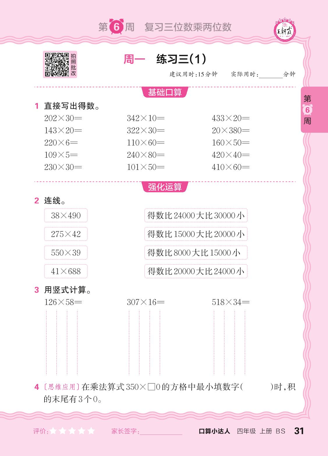 2024秋上册四年级数学北师版 口算计算专练 第6周