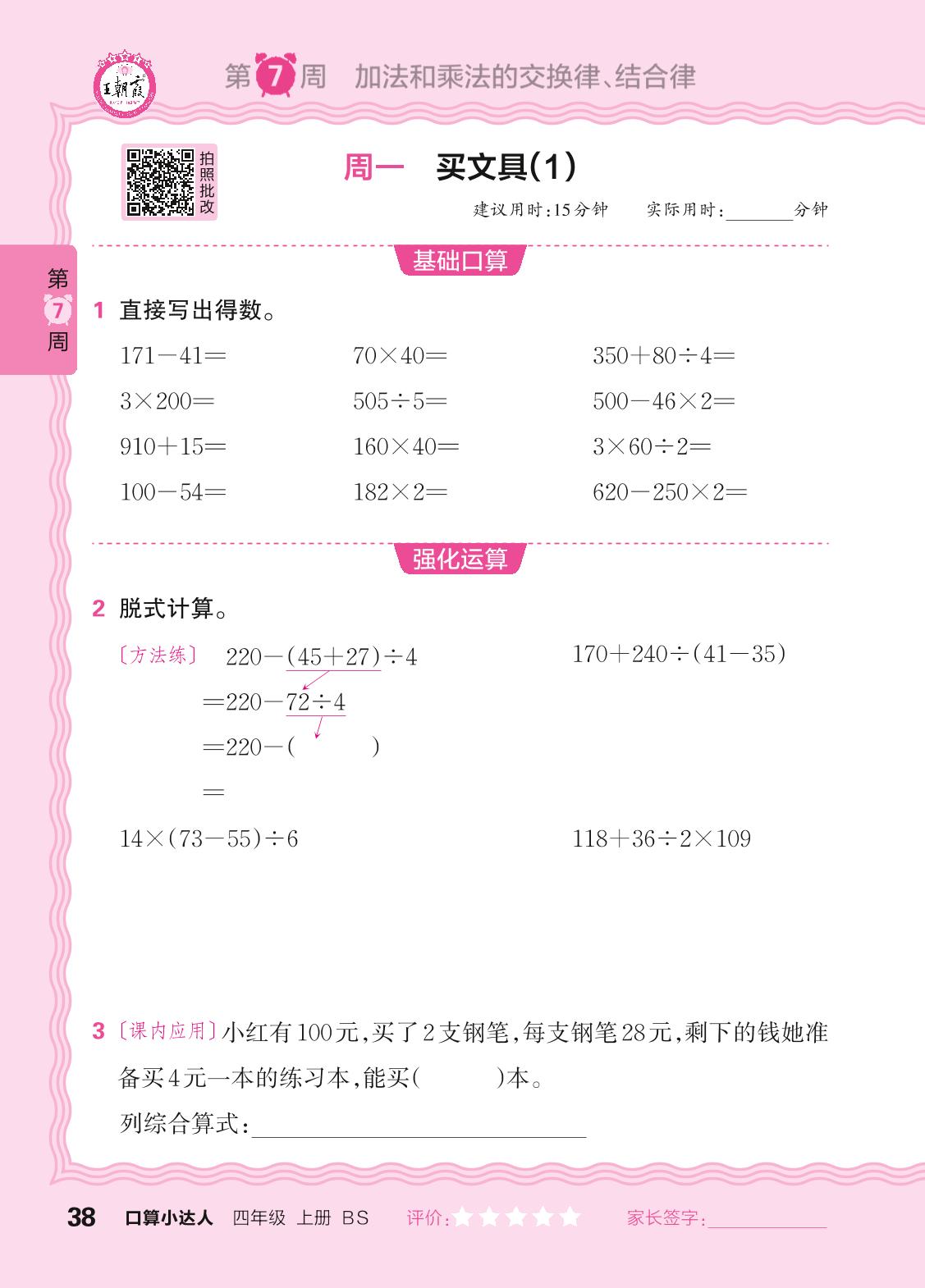 2024秋上册四年级数学北师版 口算计算专练 第7周