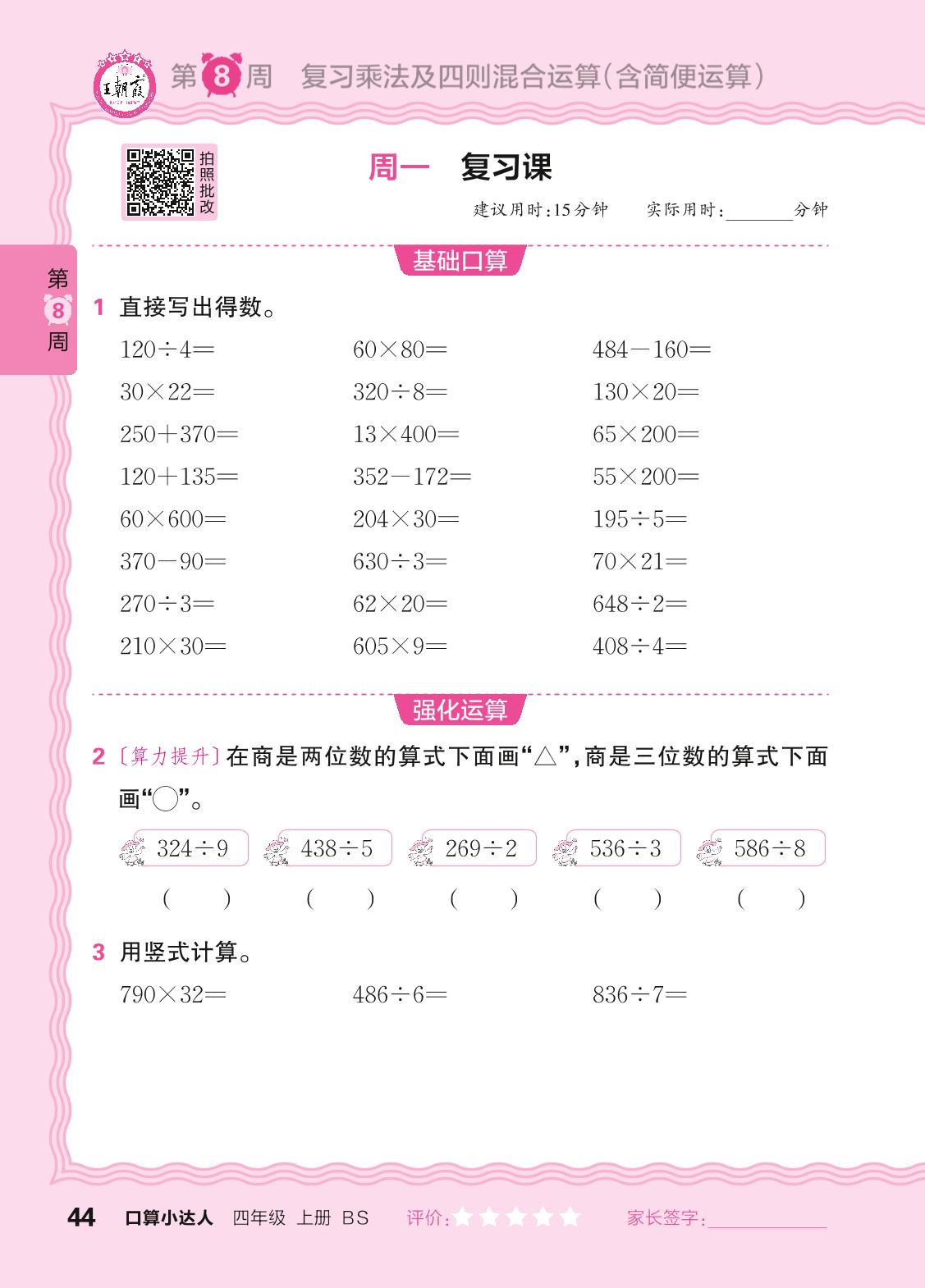 2024秋上册四年级数学北师版 口算计算专练 第8周