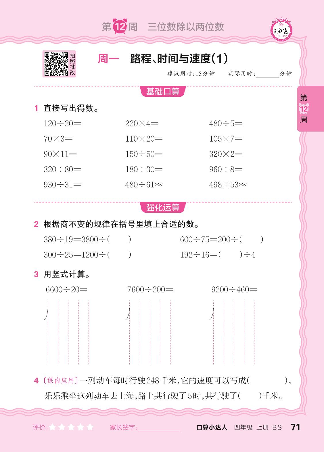 2024秋上册四年级数学北师版 口算计算专练 第12周