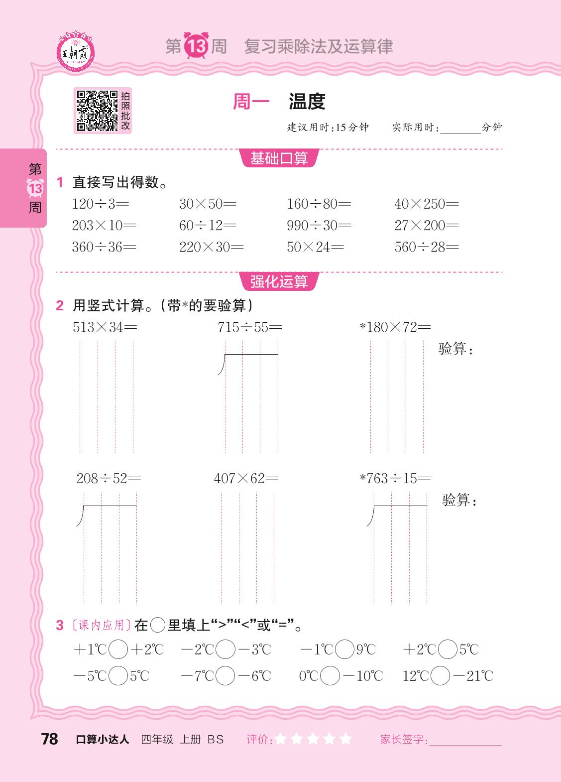 2024秋上册四年级数学北师版 口算计算专练 第13周