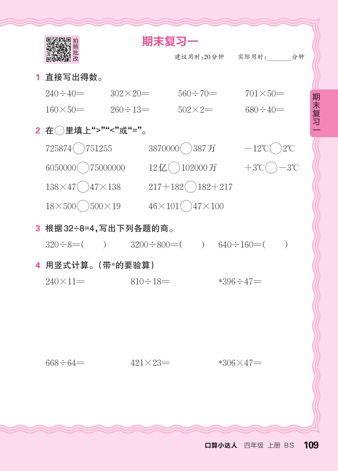 2024秋上册四年级数学北师版 期末复习一(计算专练)