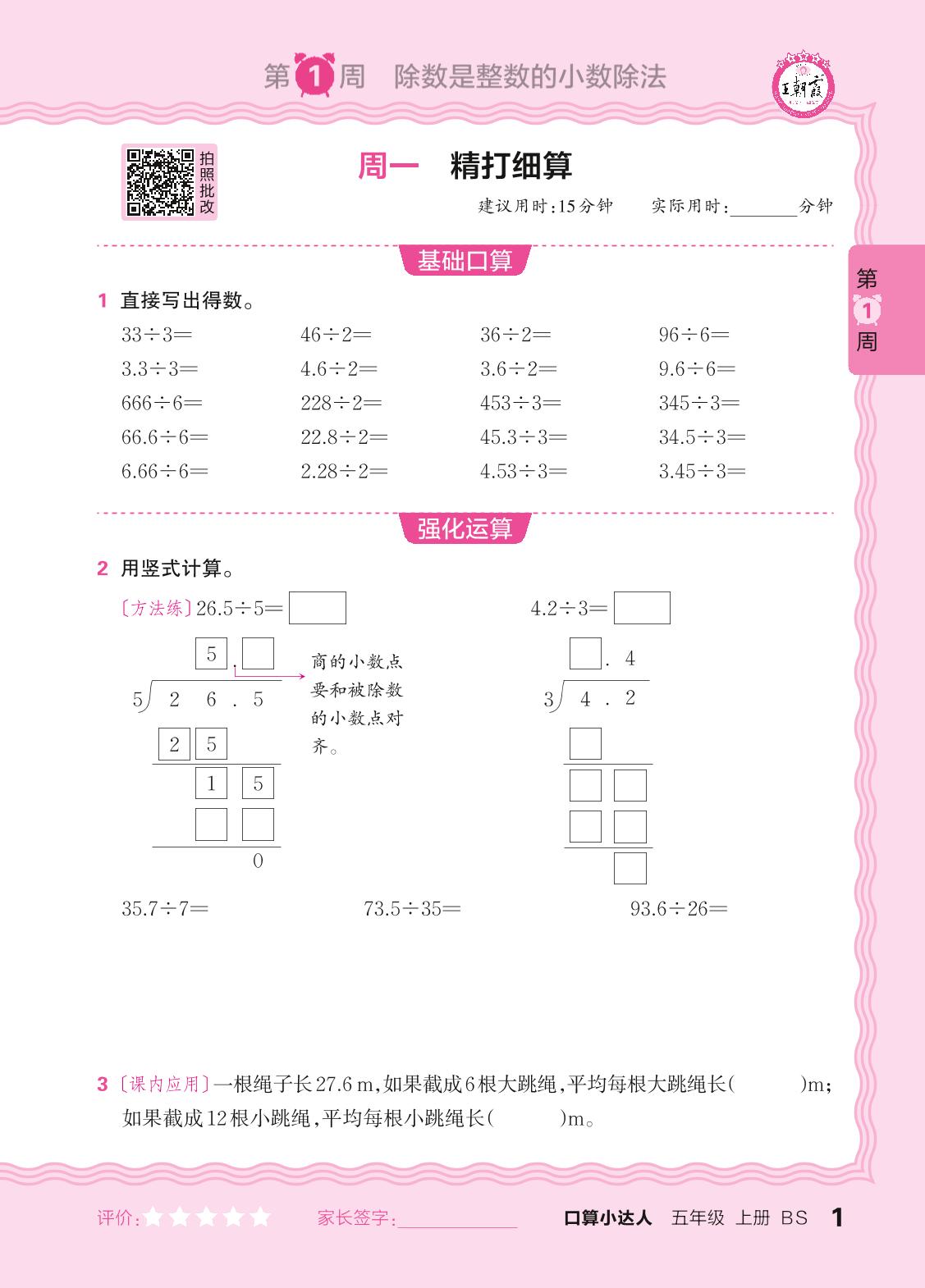 2024秋上册五年级数学北师版 口算计算专练 第1周