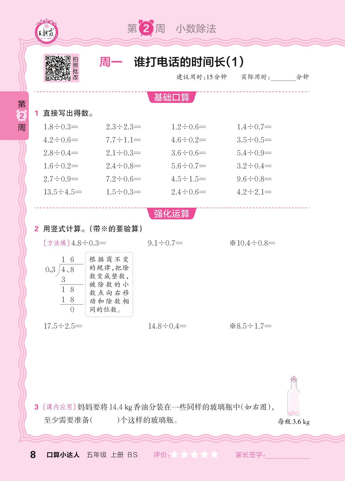 2024秋上册五年级数学北师版 口算计算专练 第2周