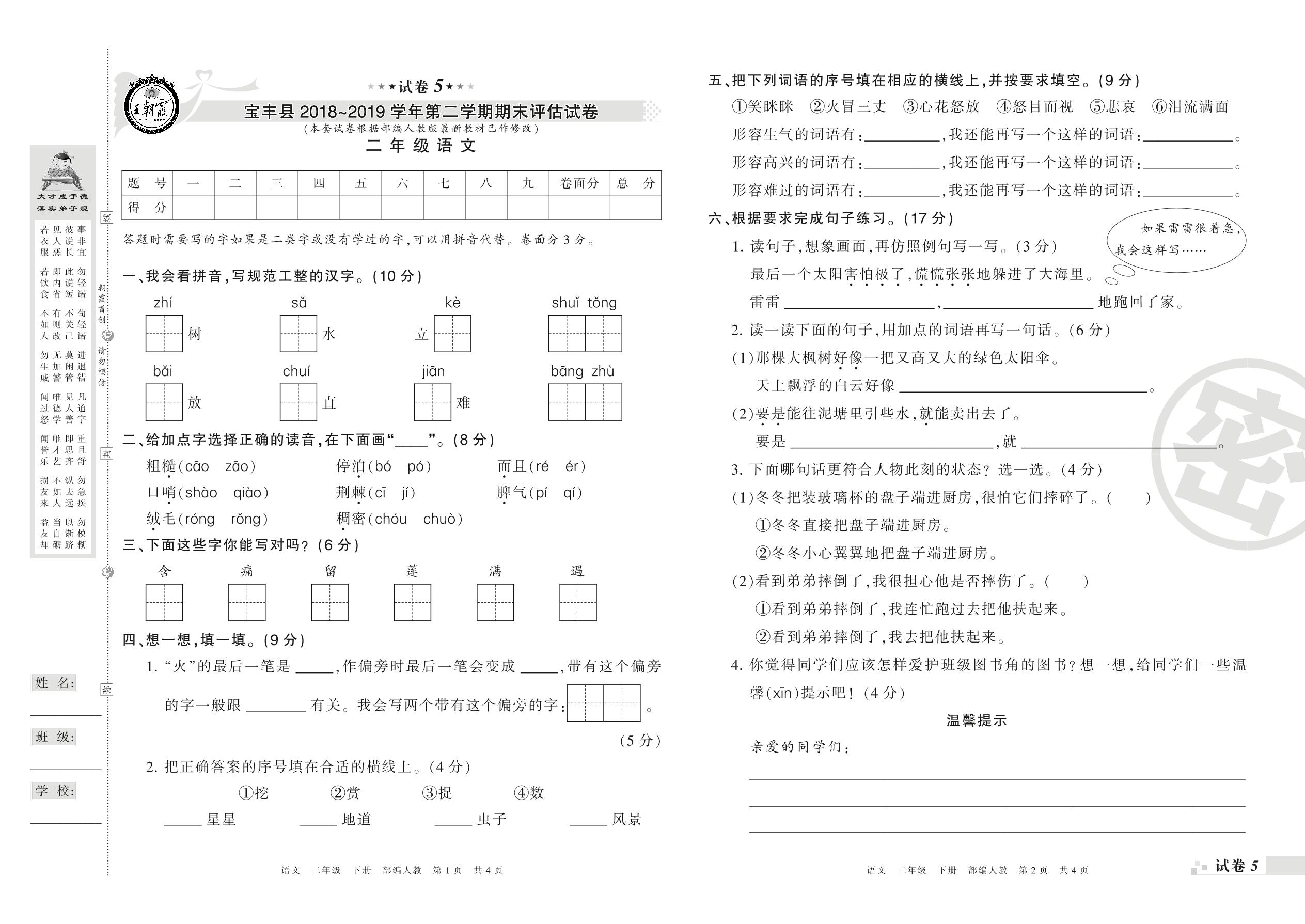 2018-2019学年第二学期平顶山市宝丰县二年级语文试卷(人教版)【5】