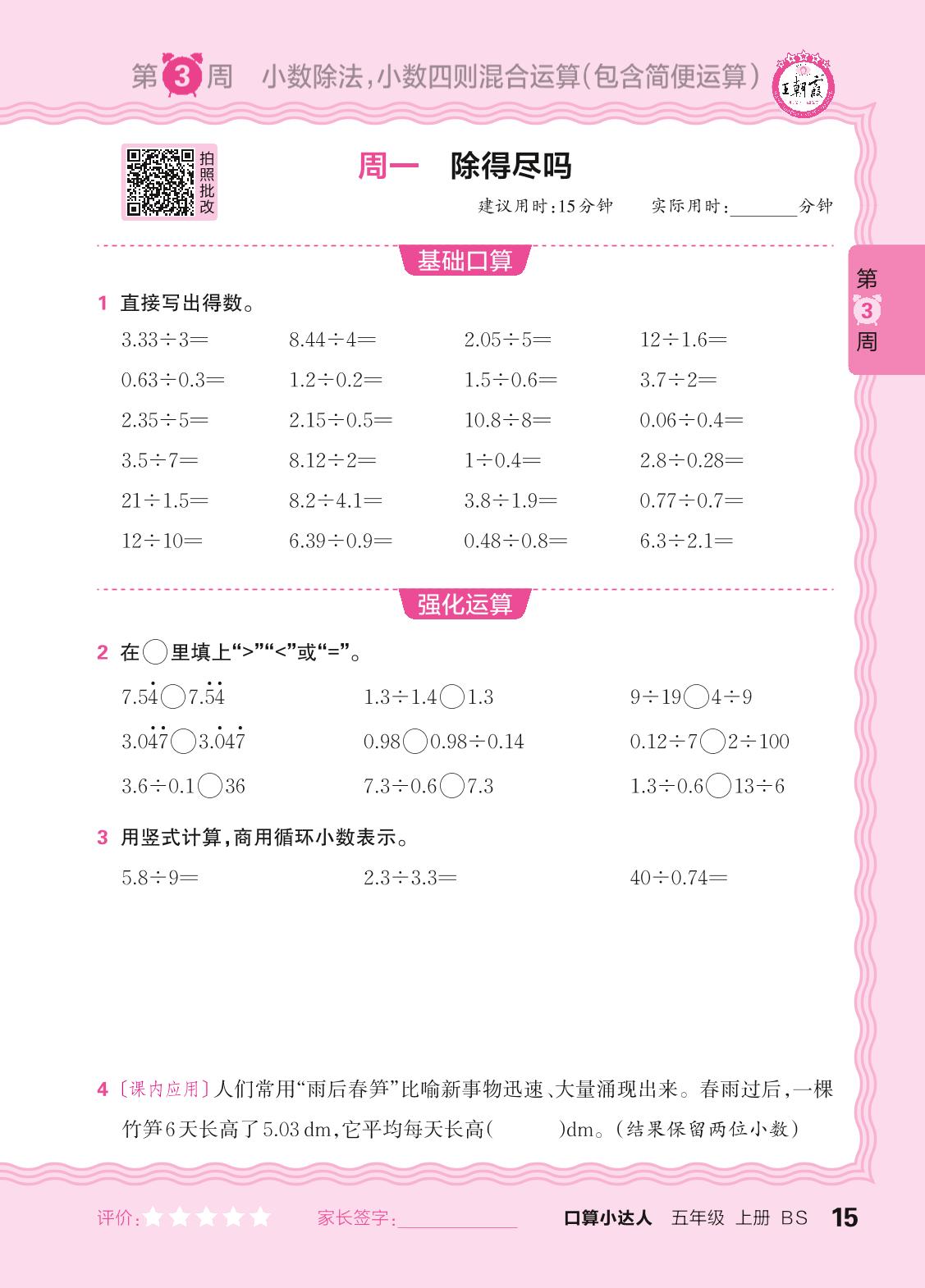 2024秋上册五年级数学北师版 口算计算专练 第3周