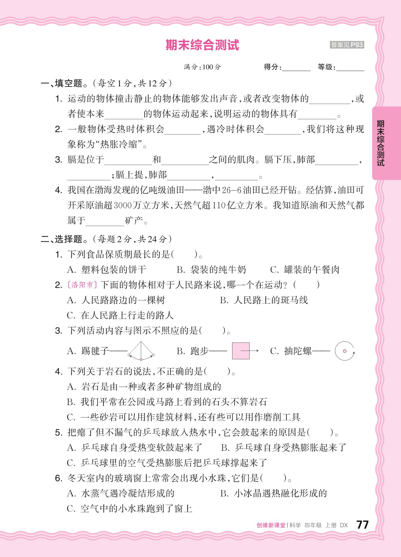 2024秋上册四年级科学大象版 期末综合测试_R240816110148941