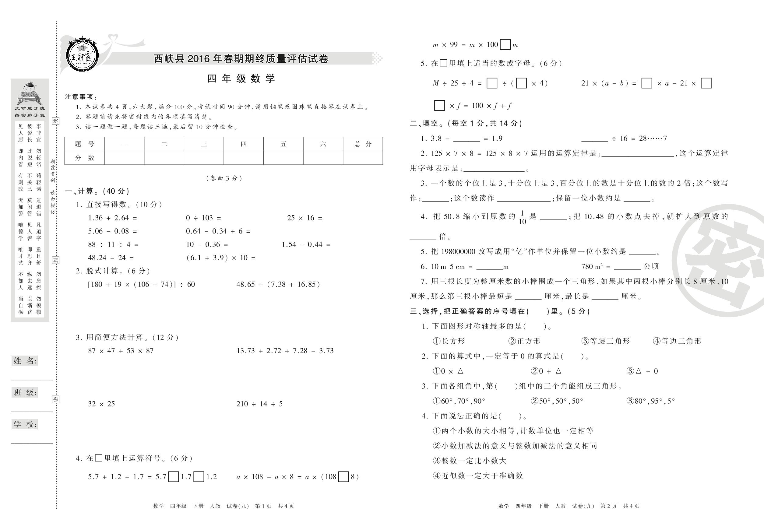 2015-2016学年第二学期南阳市西峡县四年级数学试卷(人教版)【9】