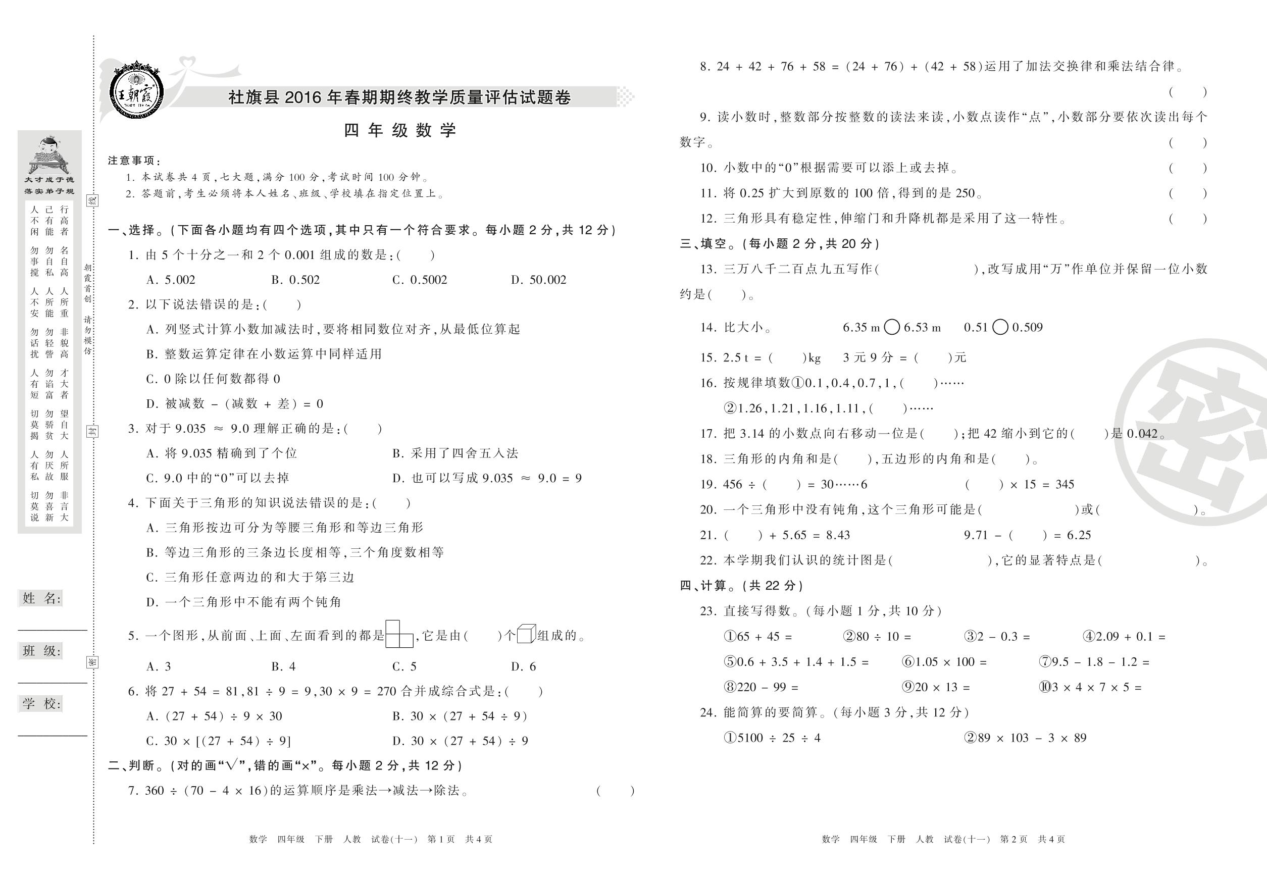 2015-2016学年第二学期南阳市社旗县四年级数学试卷(人教版)【11】