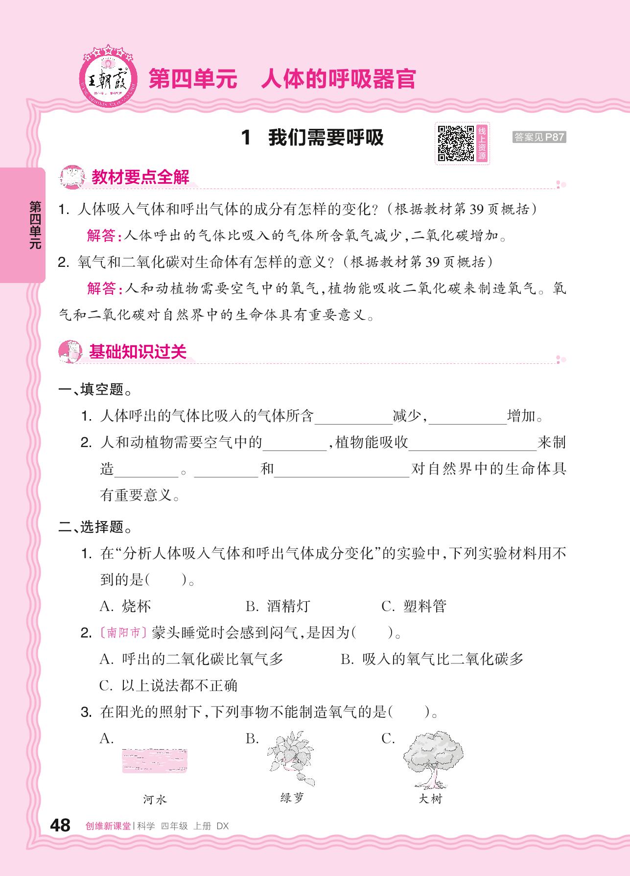 2024秋上册四年级科学大象版 第四单元 人体的呼吸器官——1. 我们需要呼吸