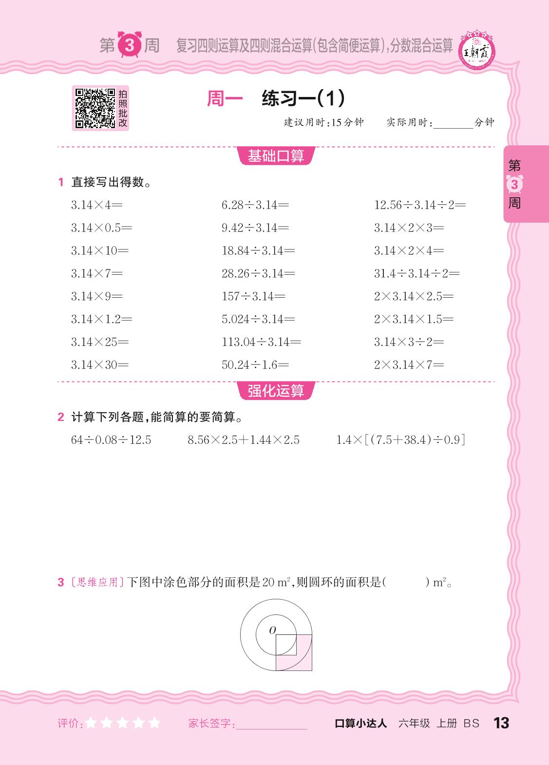 2024秋上册六年级数学北师版 口算计算专练 第3周