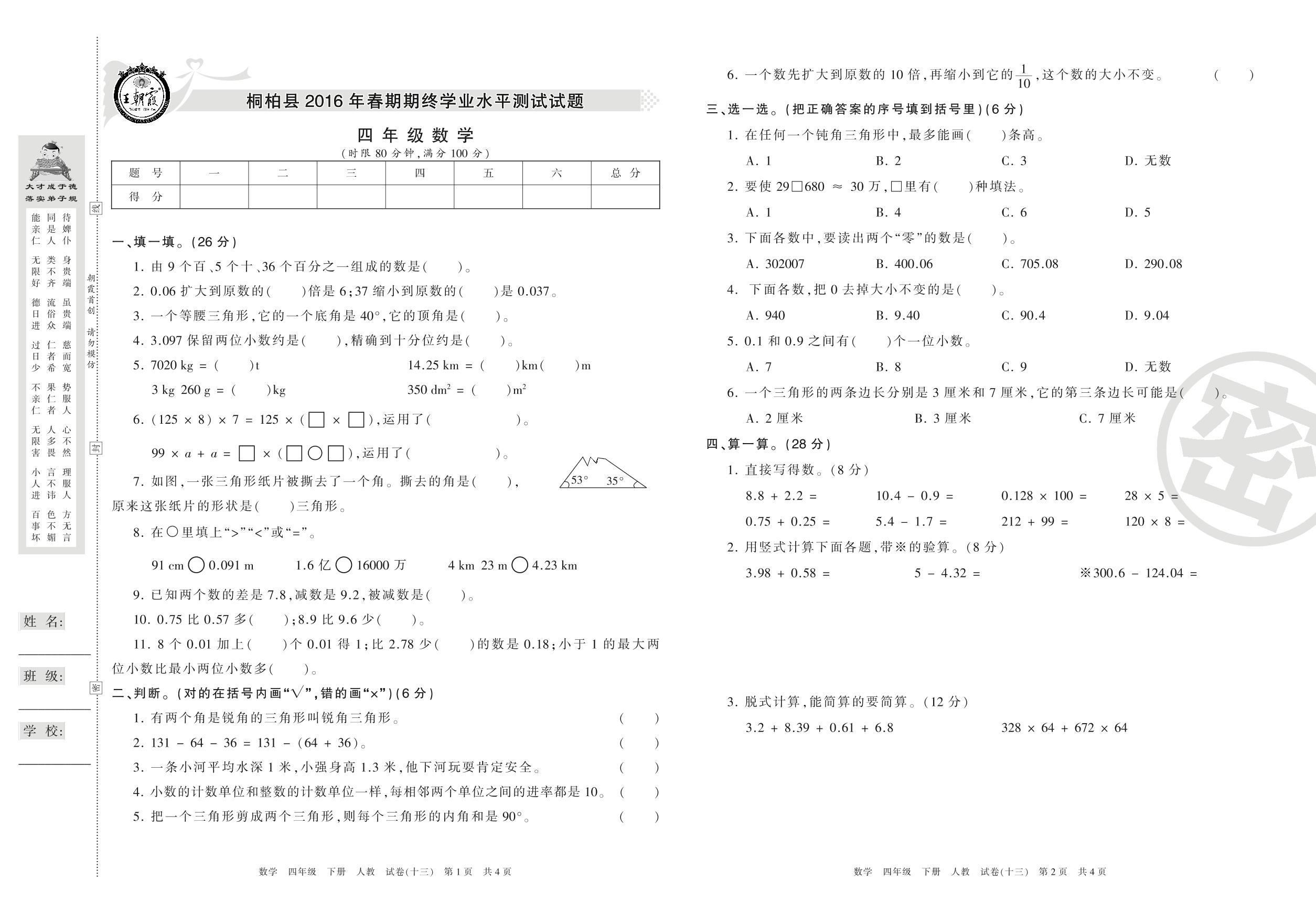 2015-2016学年第二学期南阳市桐柏县四年级数学试卷(人教版)【13】