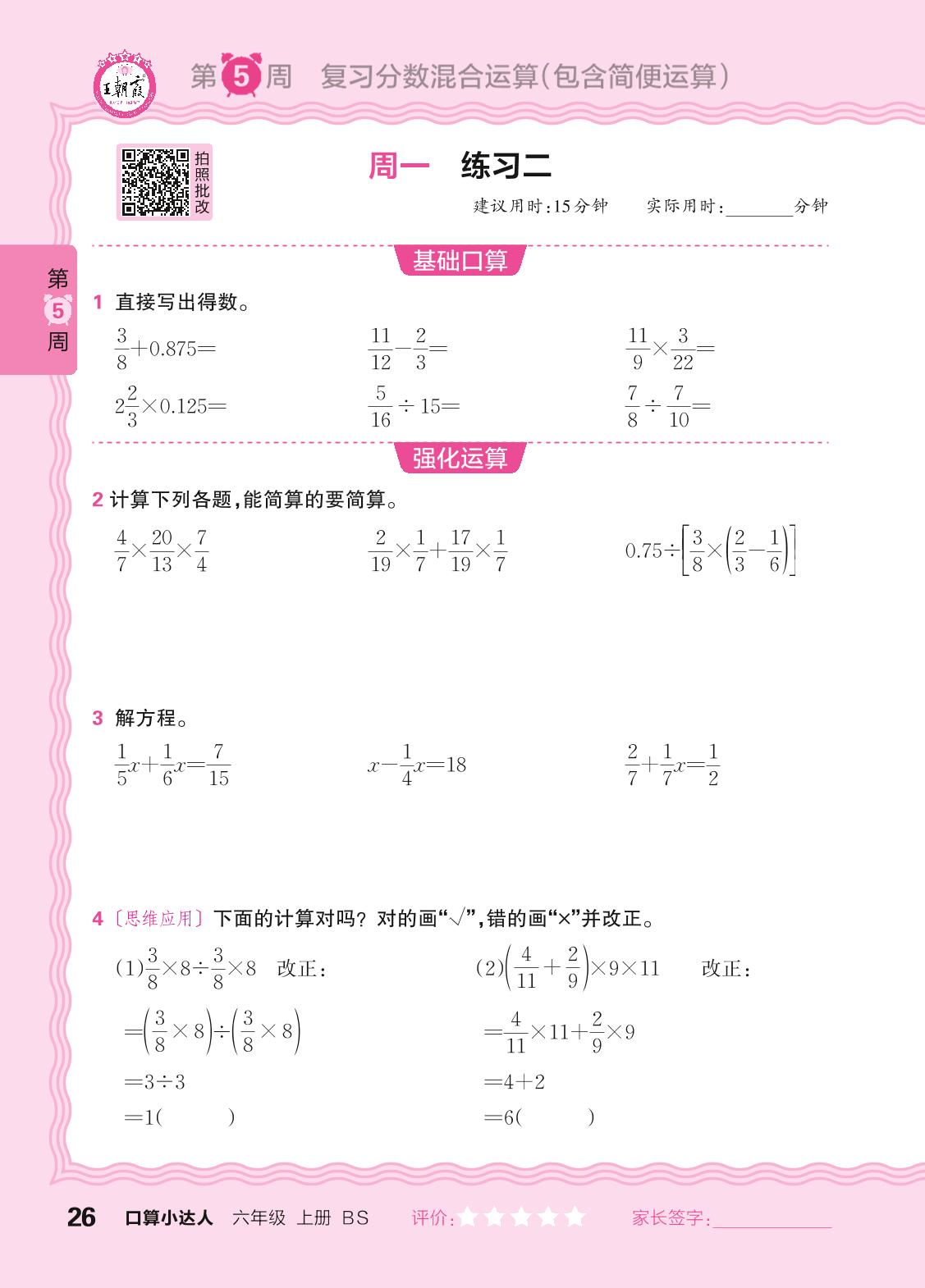 2024秋上册六年级数学北师版 口算计算专练 第5周