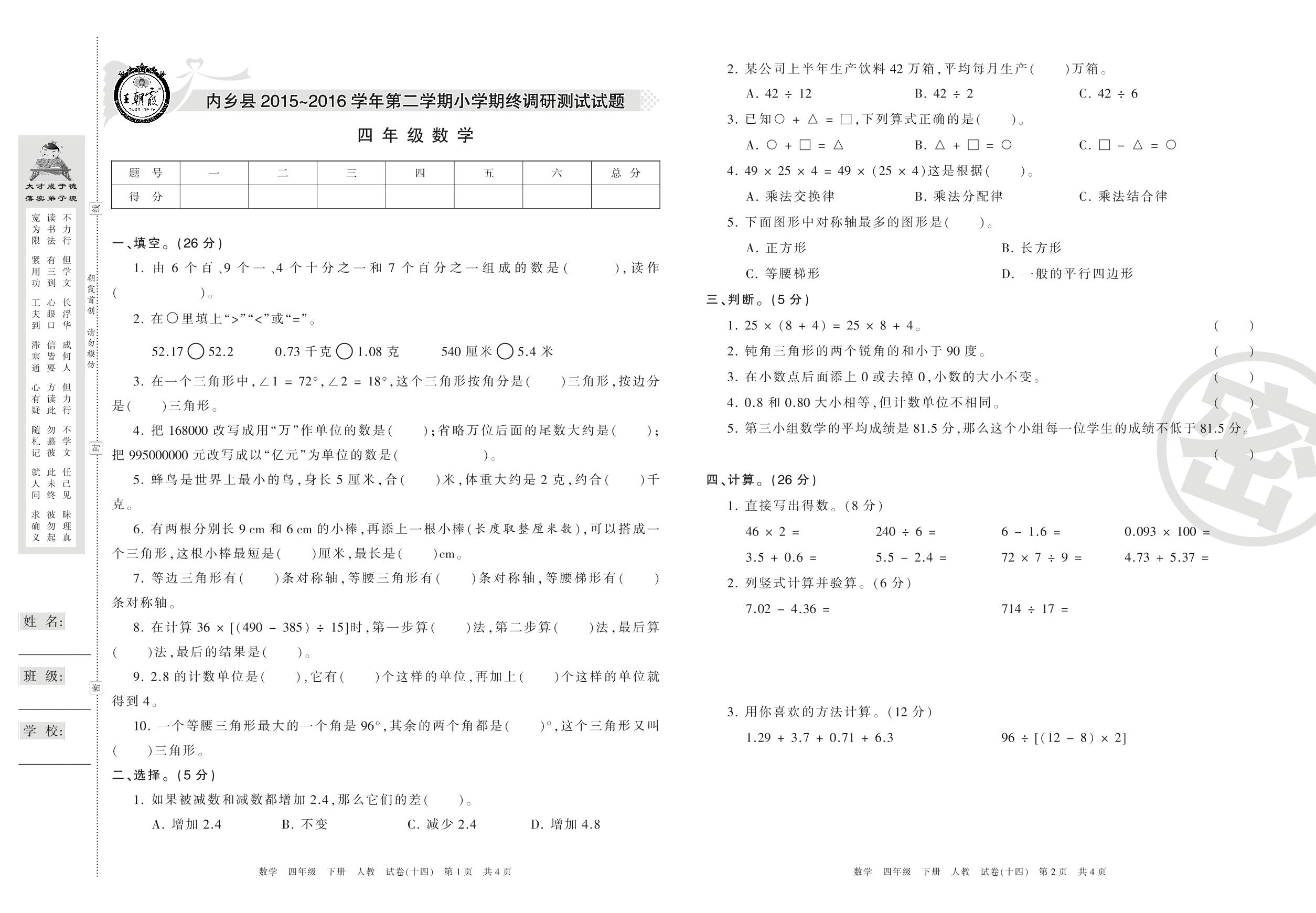 2015-2016学年第二学期南阳市内乡县四年级数学试卷(人教版)【14】