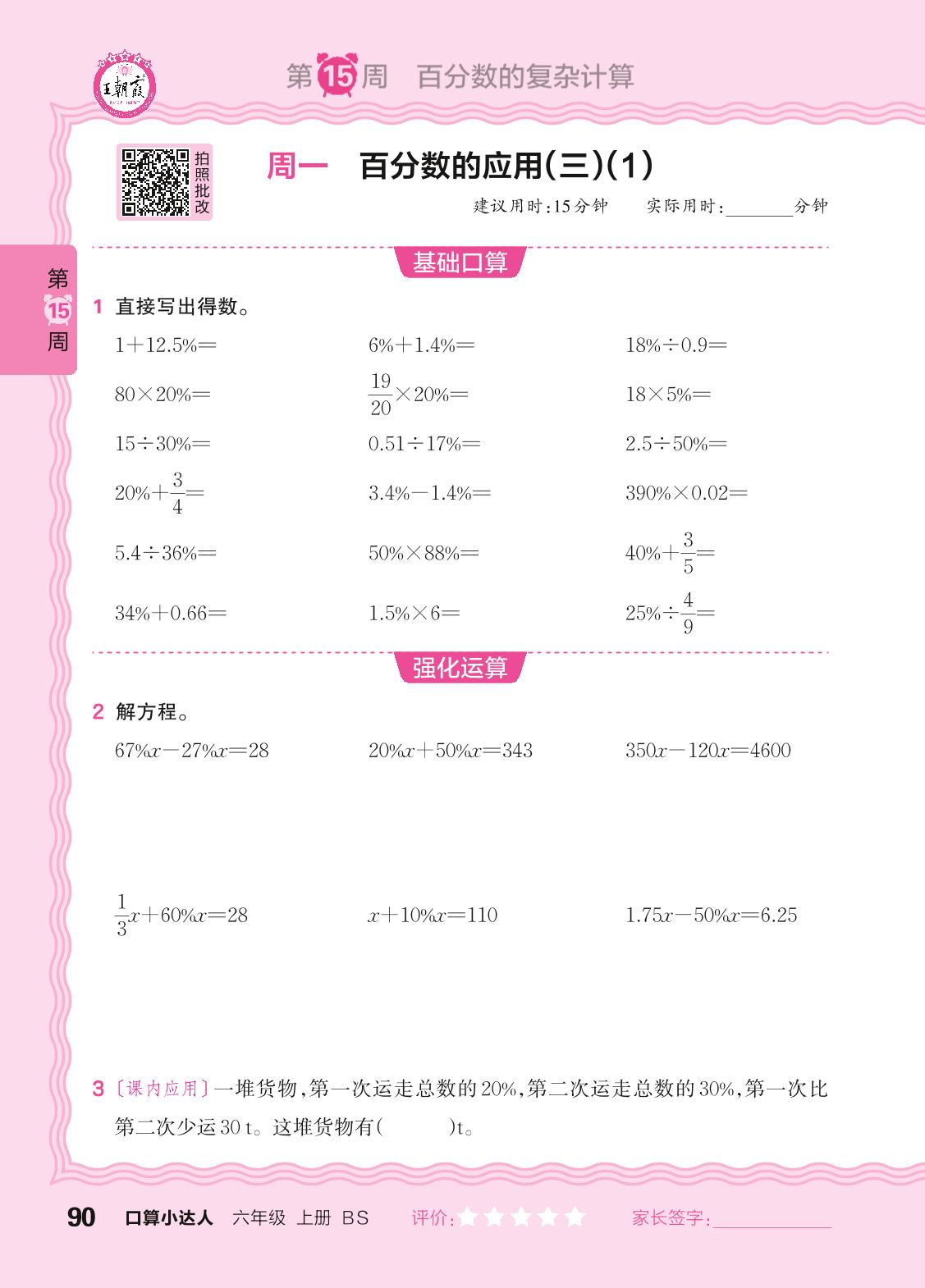 2024秋上册六年级数学北师版 口算计算专练 第15周