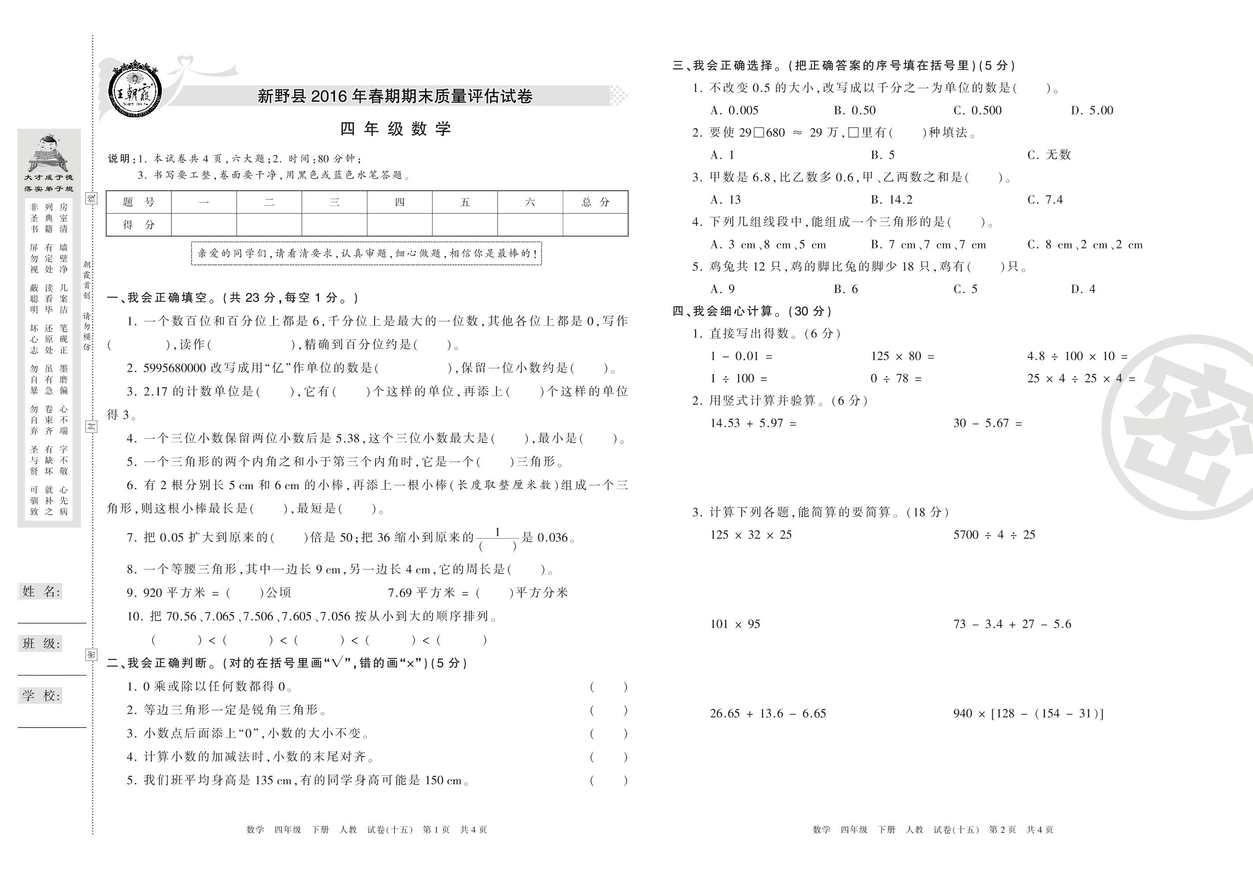 2015-2016学年第二学期南阳市新野县四年级数学试卷(人教版)【15】