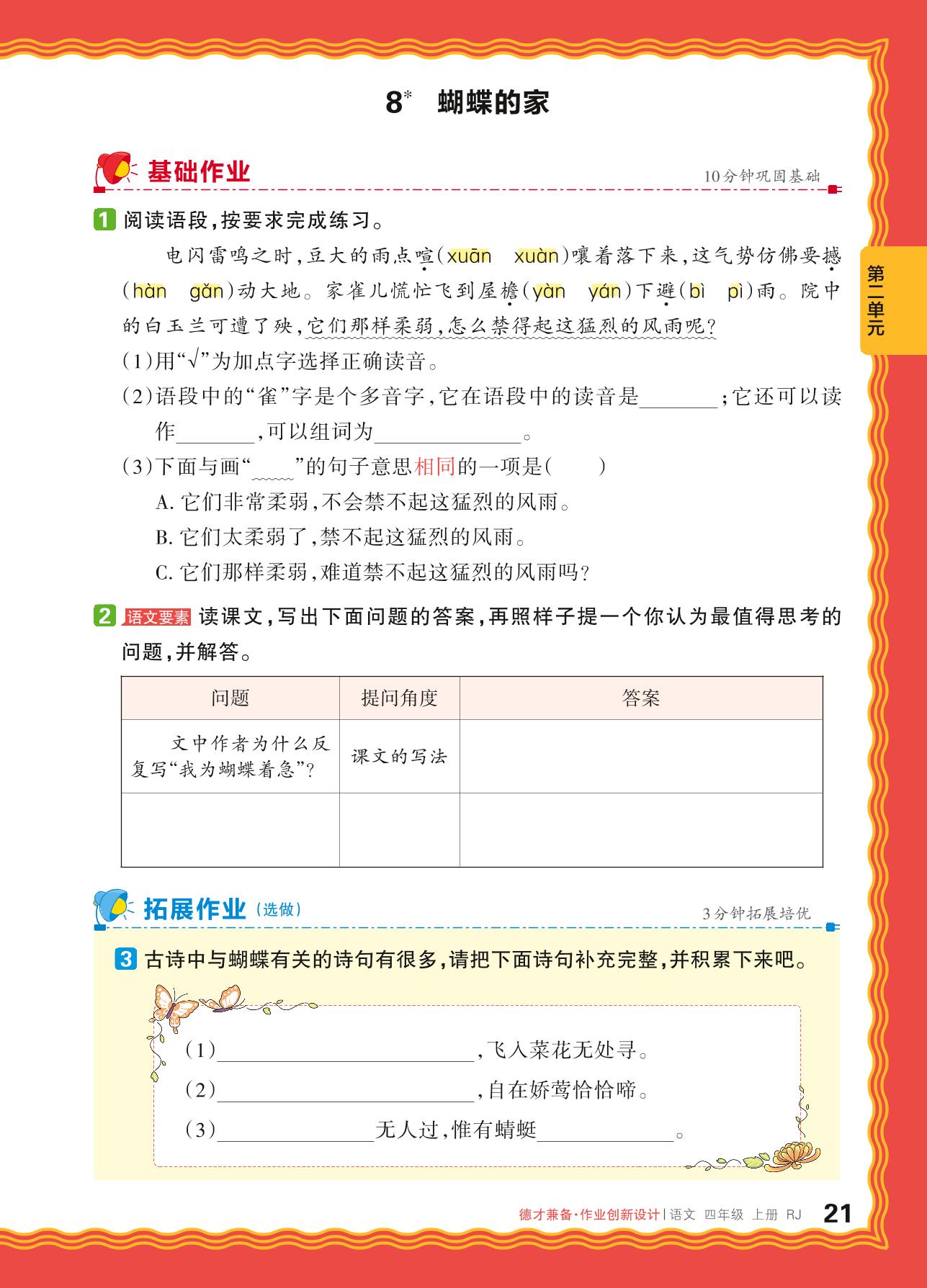 2024秋上册四年级语文人教版 第二单元 阅读策略:提问——8. 蝴蝶的家