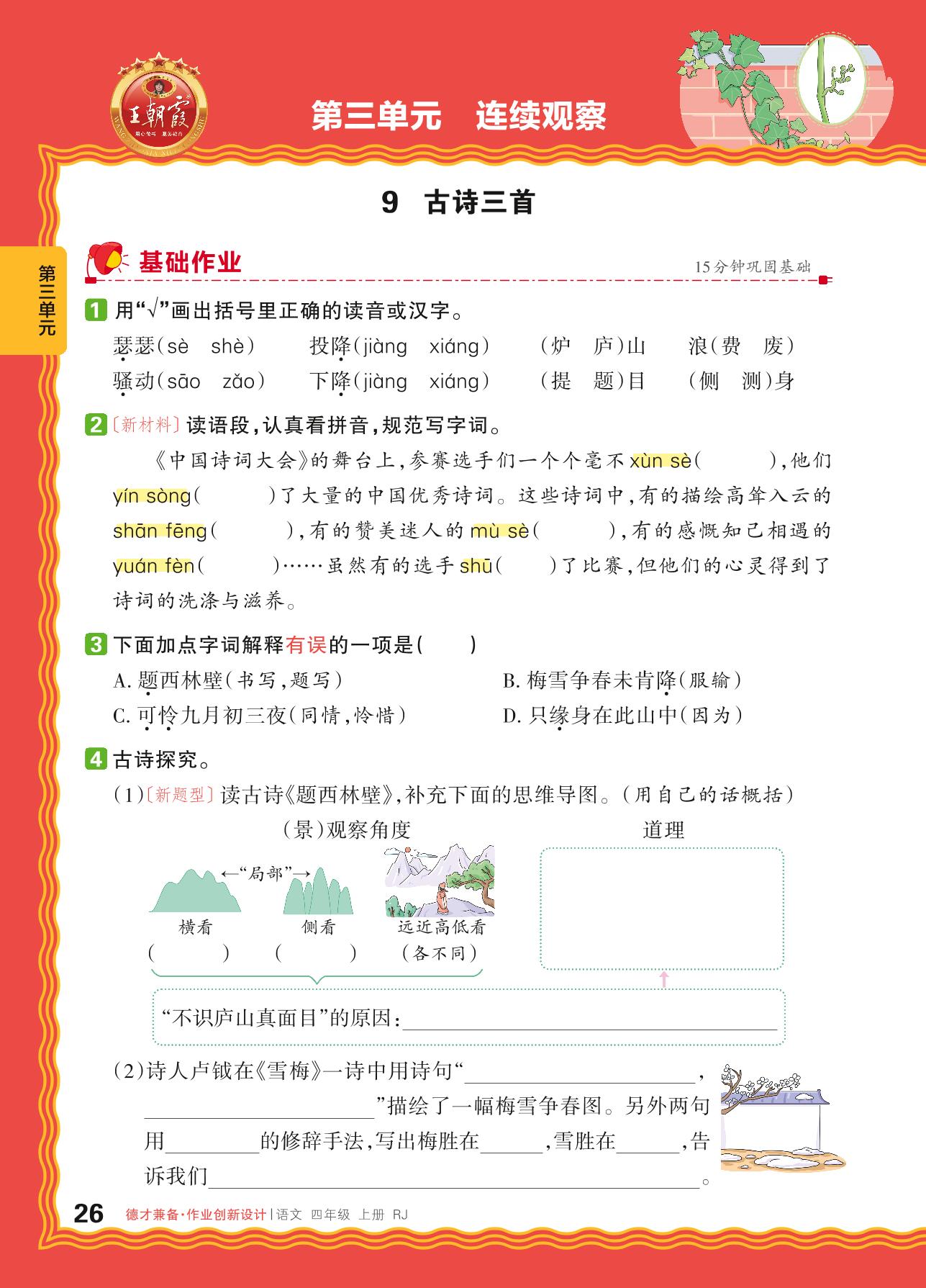 2024秋上册四年级语文人教版 第三单元 连续观察——9. 古诗三首