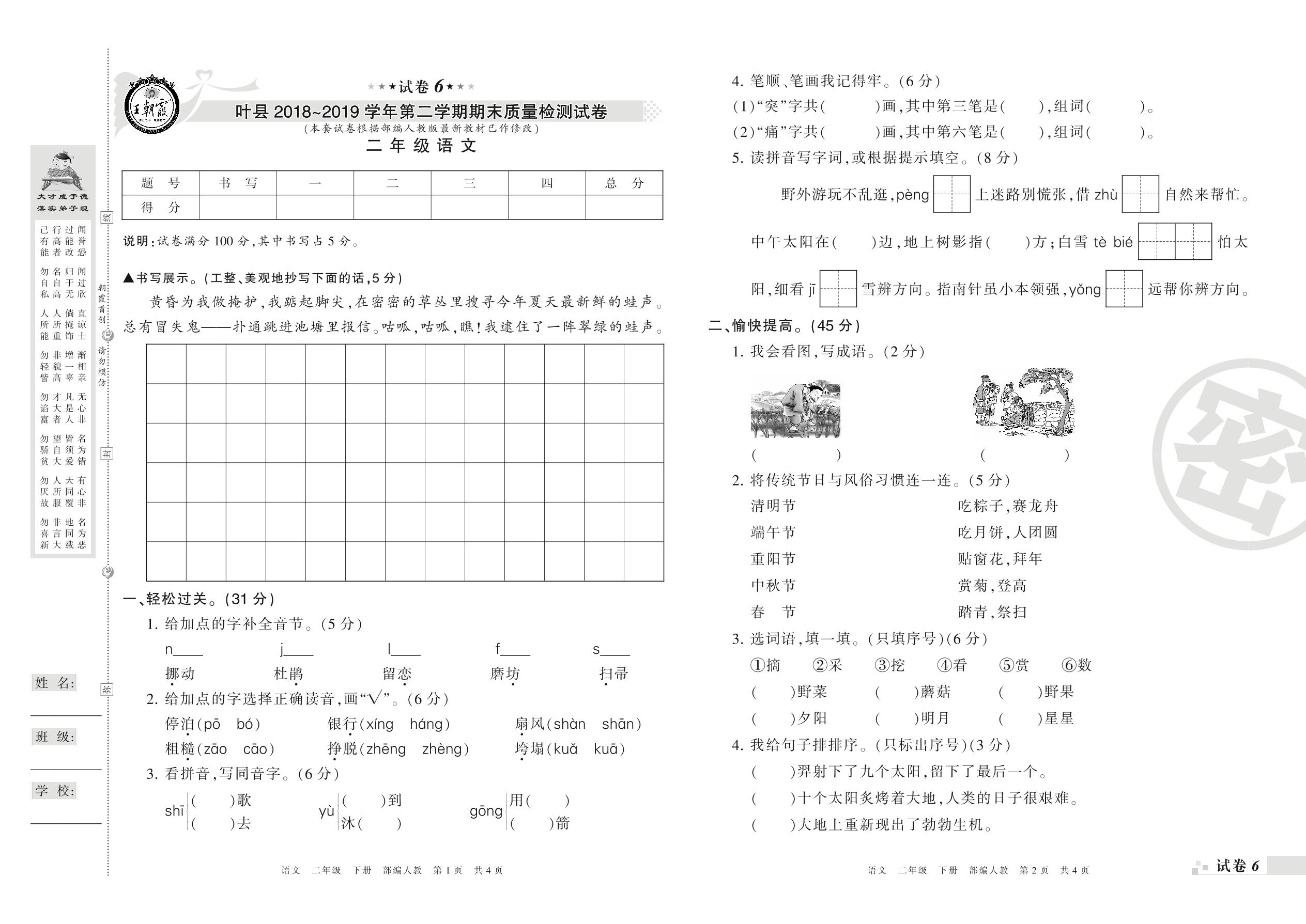 2018-2019学年第二学期平顶山市叶县二年级语文试卷(人教版)【6】