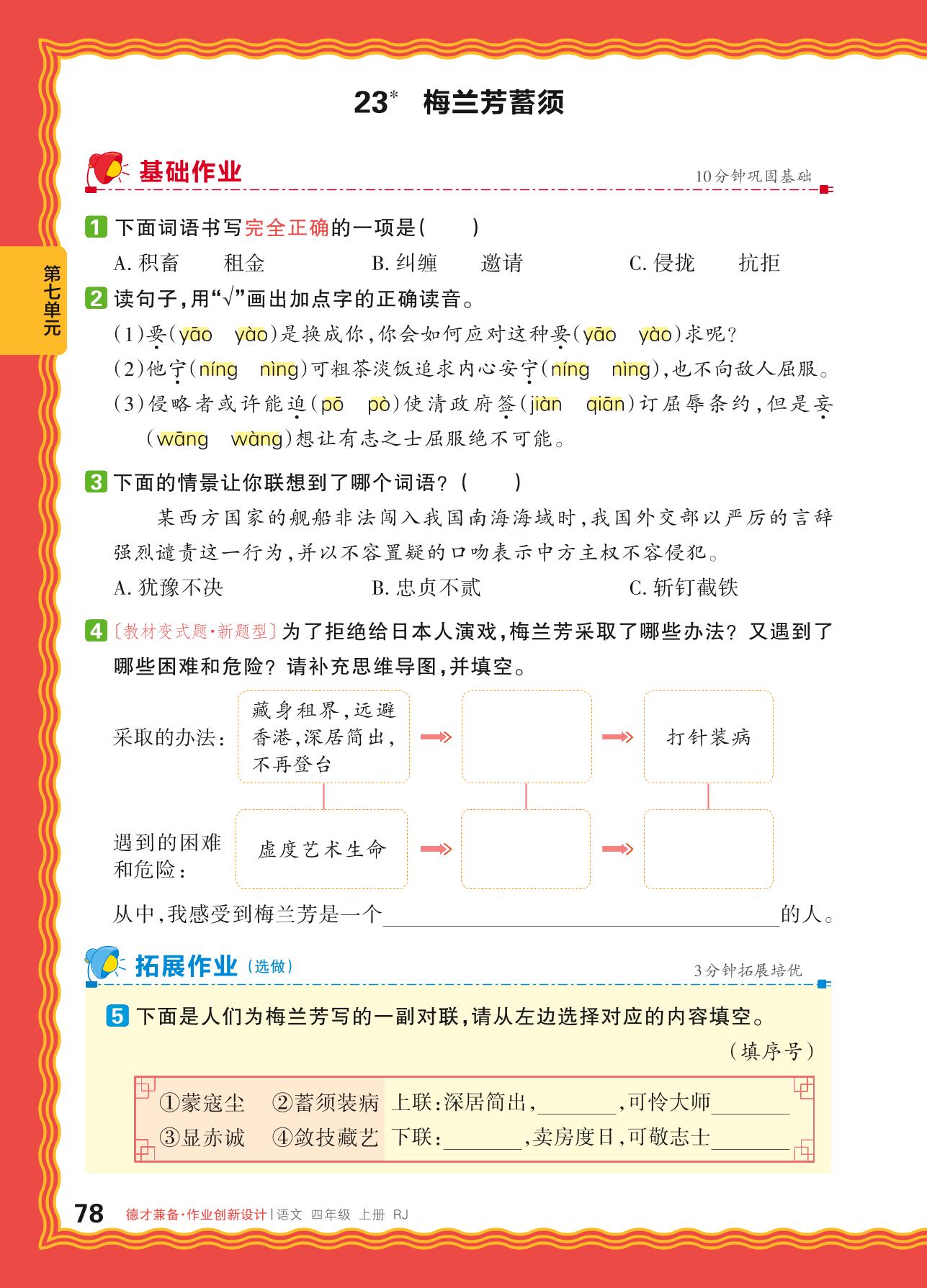 2024秋上册四年级语文人教版 第七单元 家国情怀——23. 梅兰芳蓄须