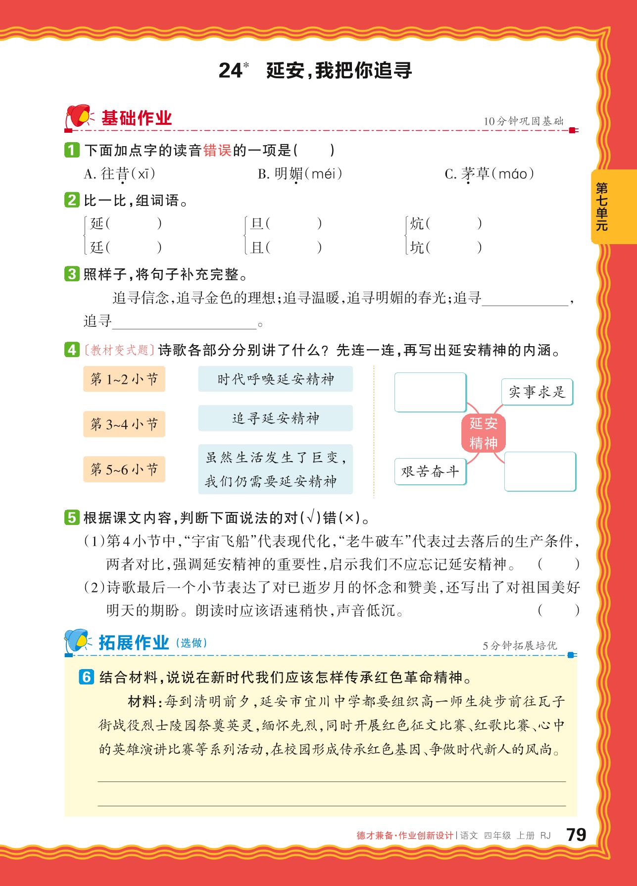 2024秋上册四年级语文人教版 第七单元 家国情怀——24. 延安,我把你追寻