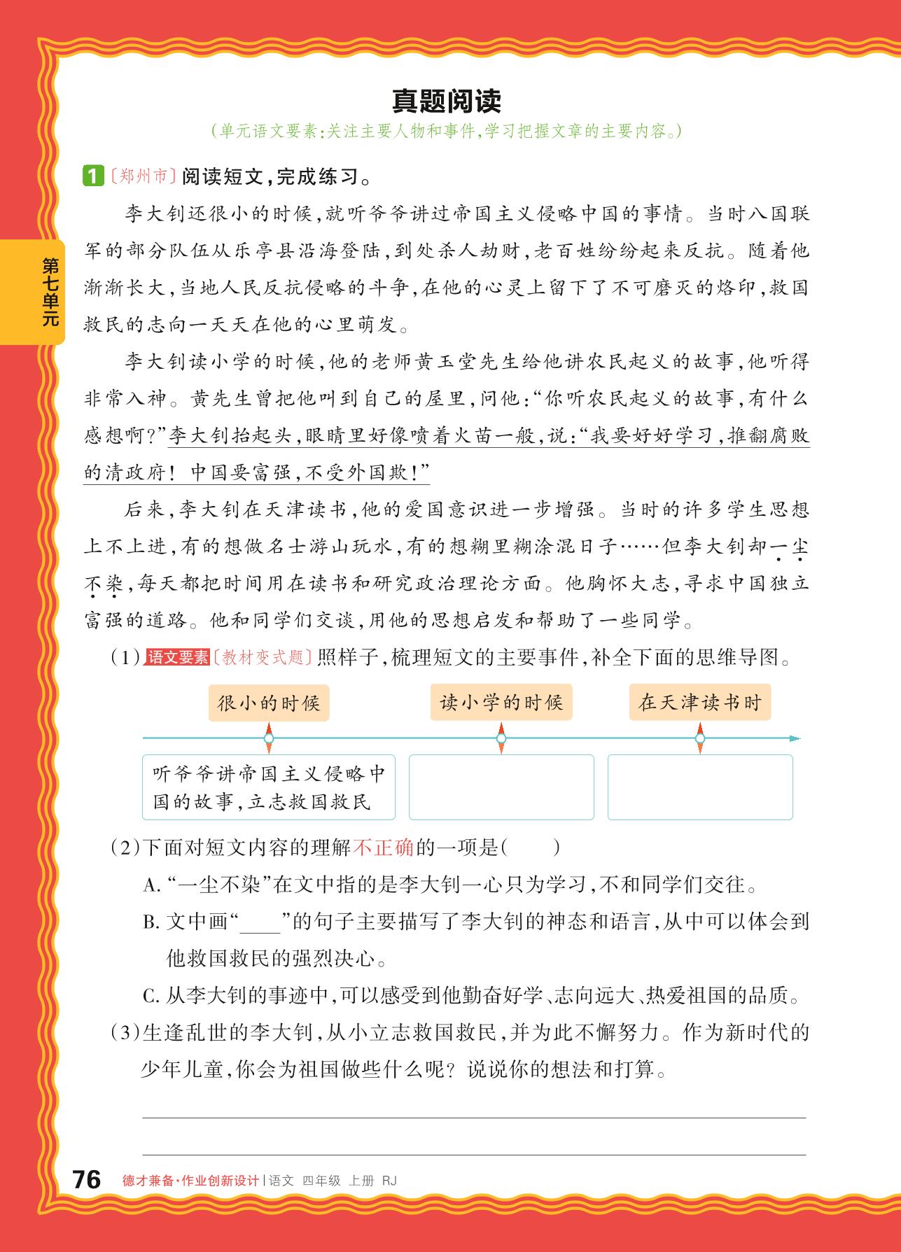 2024秋上册四年级语文人教版 第七单元 家国情怀——真题阅读