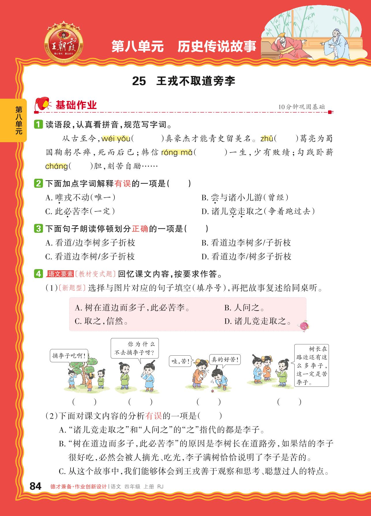 2024秋上册四年级语文人教版 第八单元 历史传说故事——25. 王戎不取道旁李