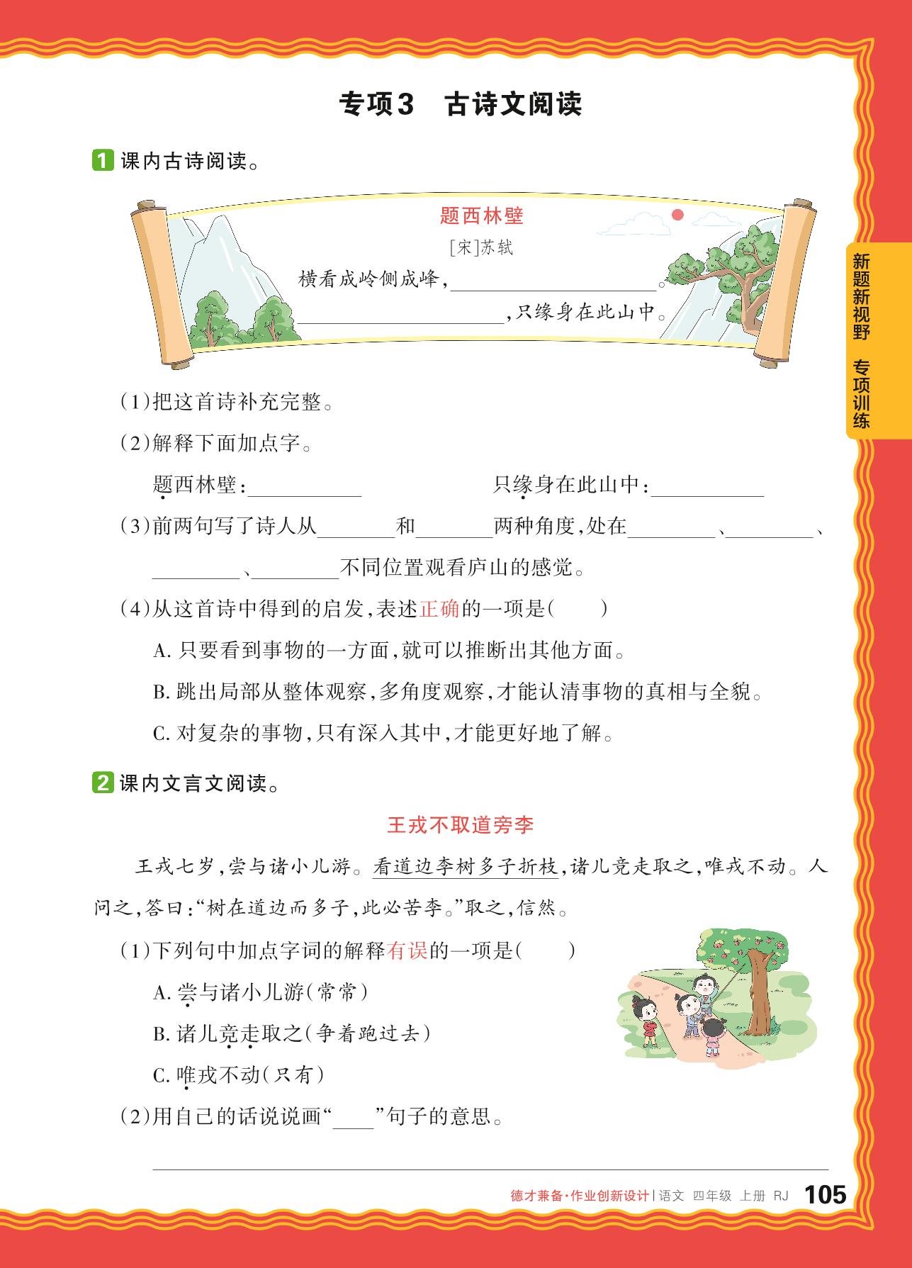 2024秋上册四年级语文人教版 新题新视野 专项训练——古诗文阅读【3】