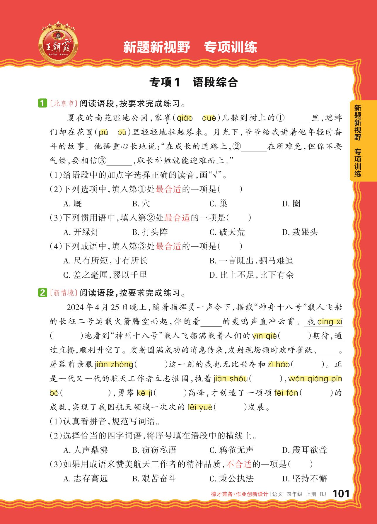 2024秋上册四年级语文人教版 新题新视野 专项训练——语段综合【1】