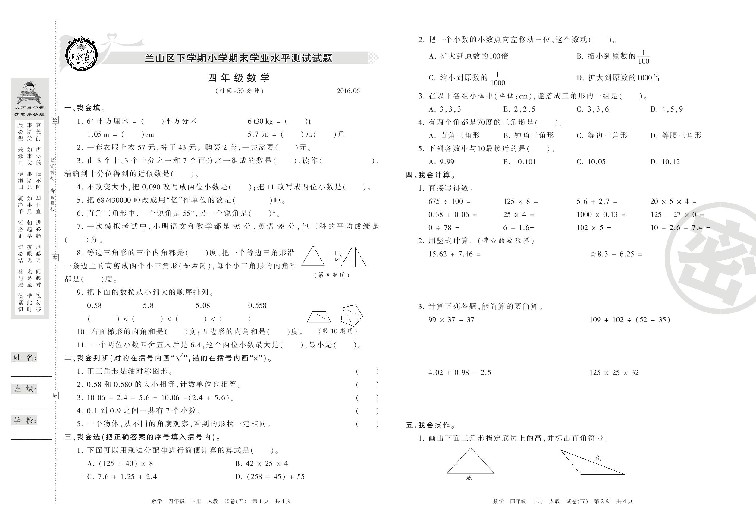 2015-2016学年第二学期临沂市兰山区四年级数学试卷(人教版)【5】