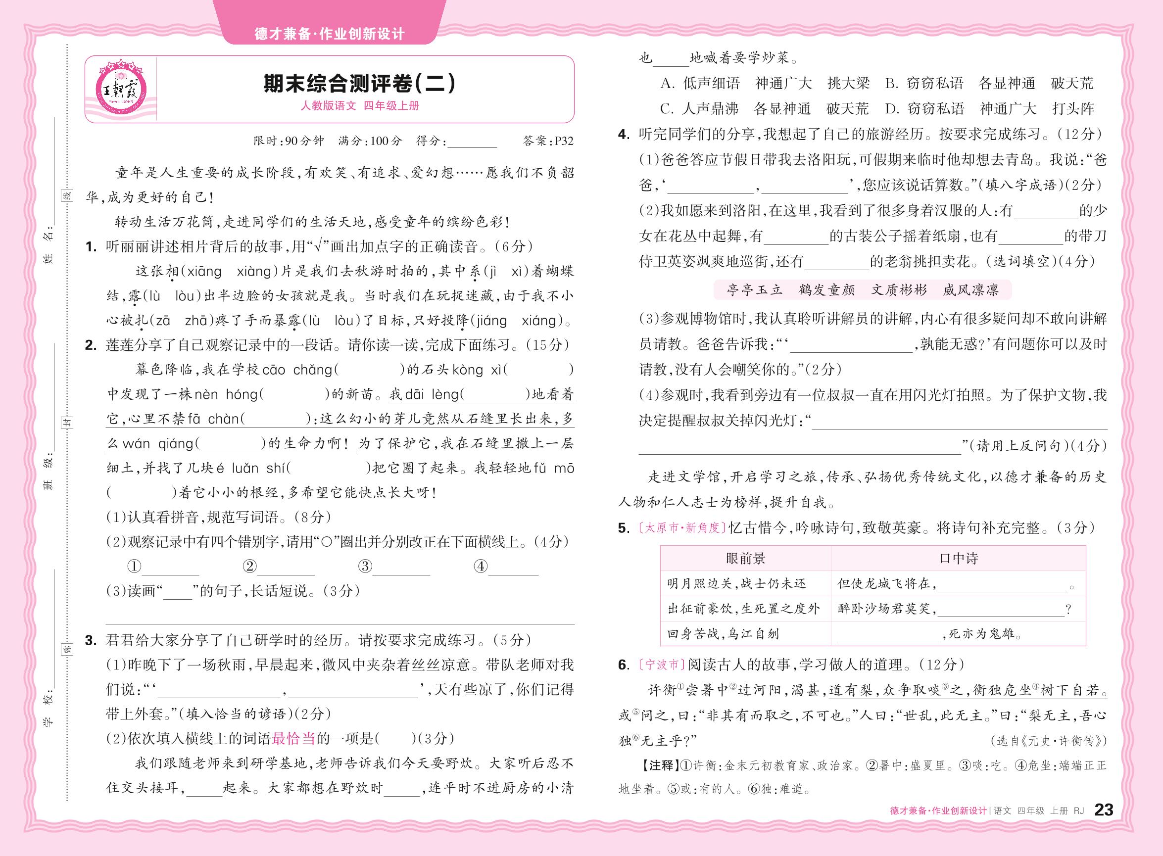 2024秋上册四年级语文人教版 期末综合测评卷(二)