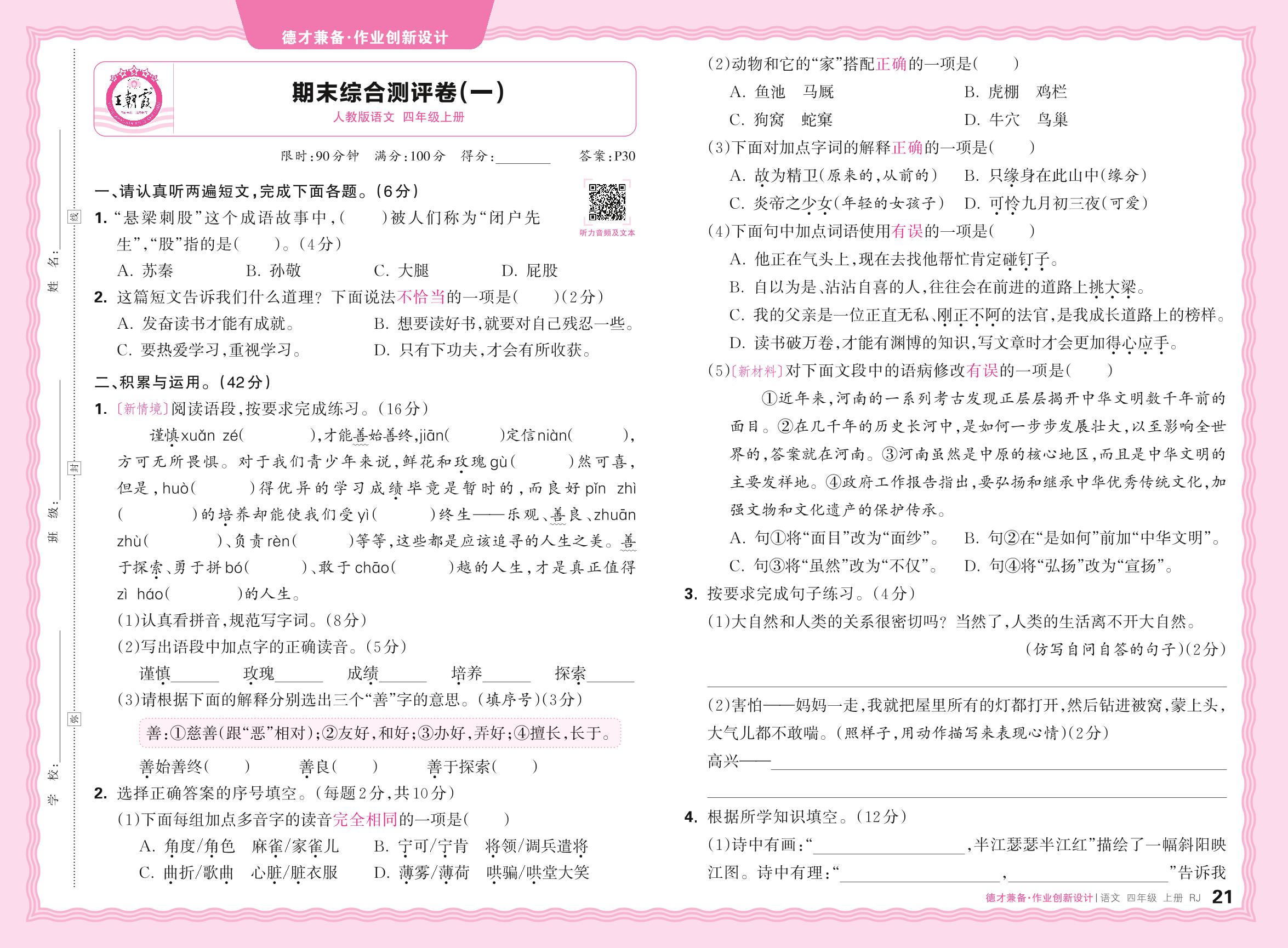 2024秋上册四年级语文人教版 期末综合测评卷(一)