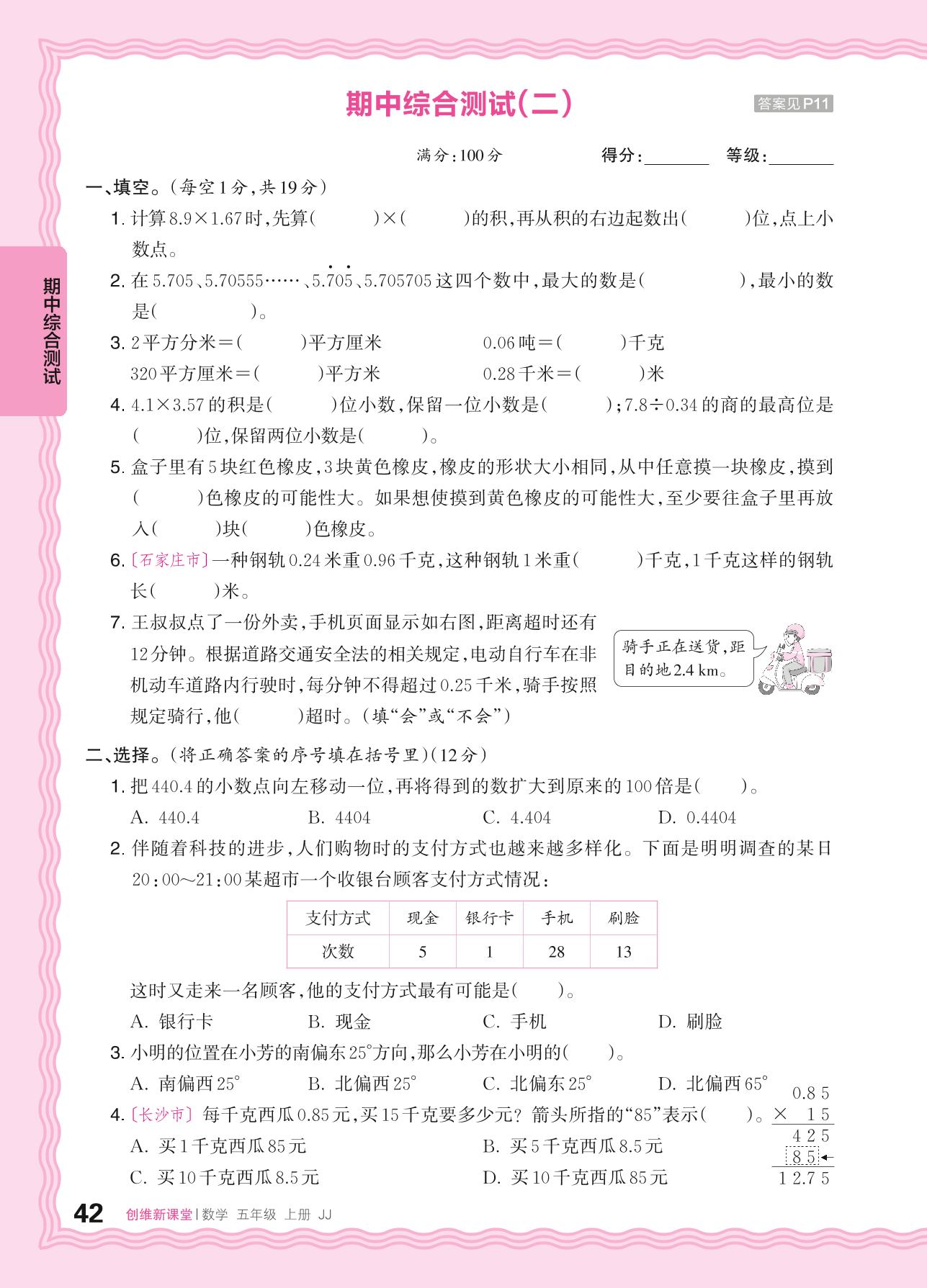 2024秋上册五年级数学冀教版 期中综合测试(二)
