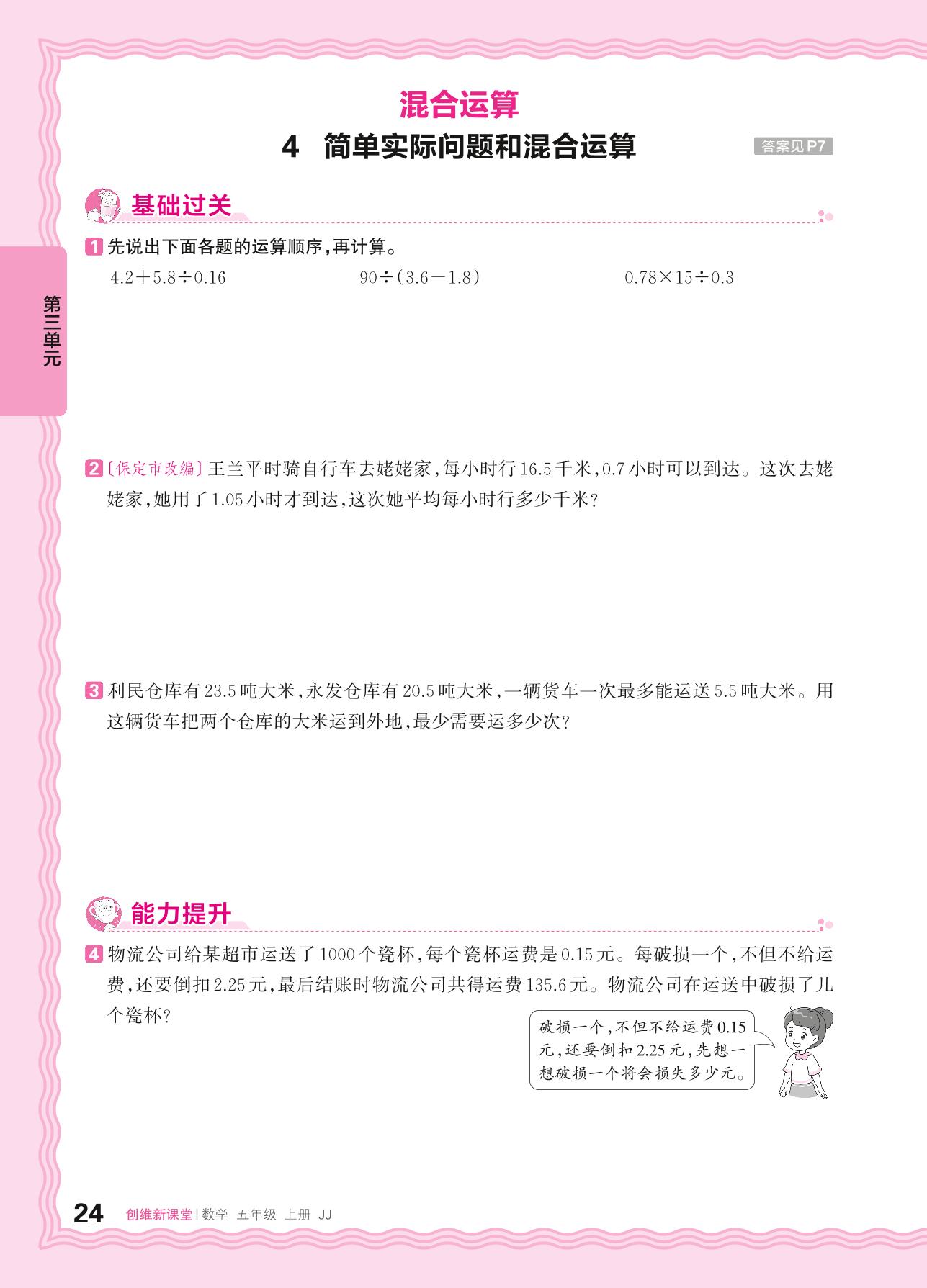 2024秋上册五年级数学冀教版 第三单元 小数除法——4. 简单实际问题和混合运算