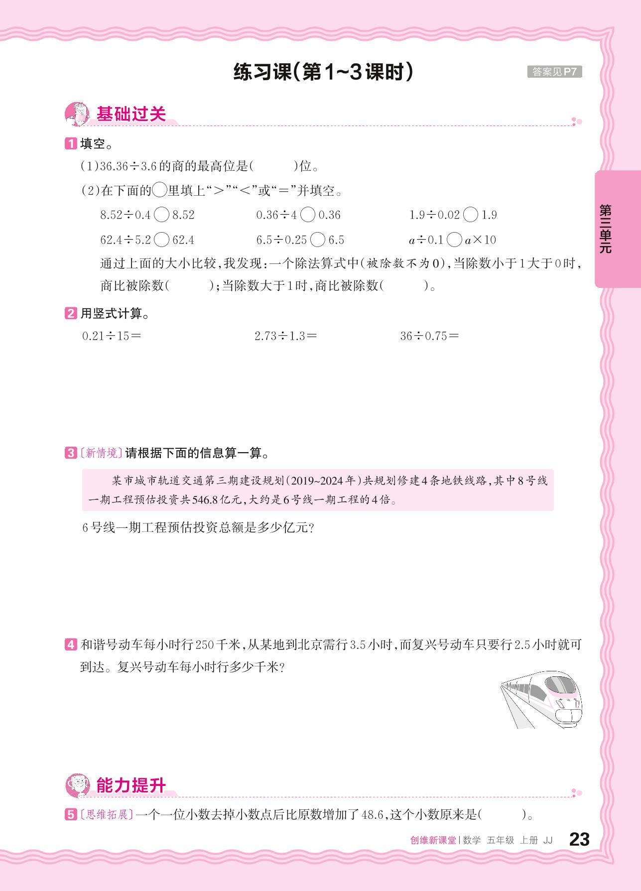 2024秋上册五年级数学冀教版 第三单元 小数除法——小数除法练习课