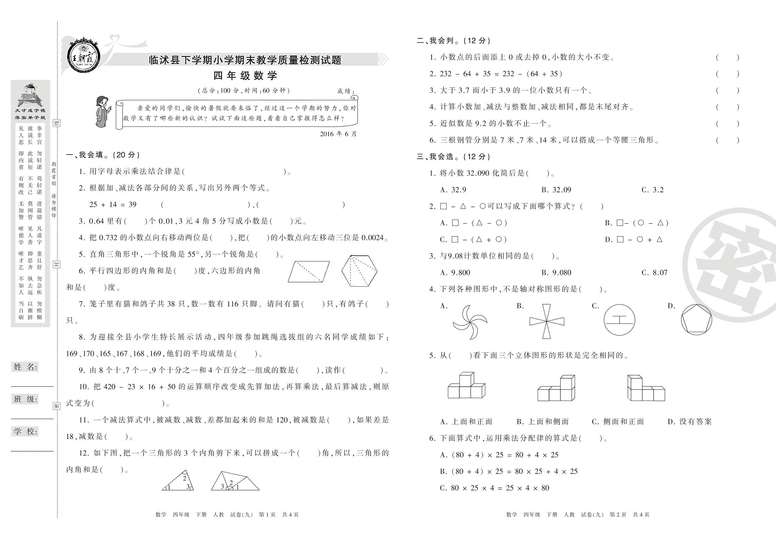 2015-2016学年第二学期临沂市临沭县四年级数学试卷(人教版)【9】