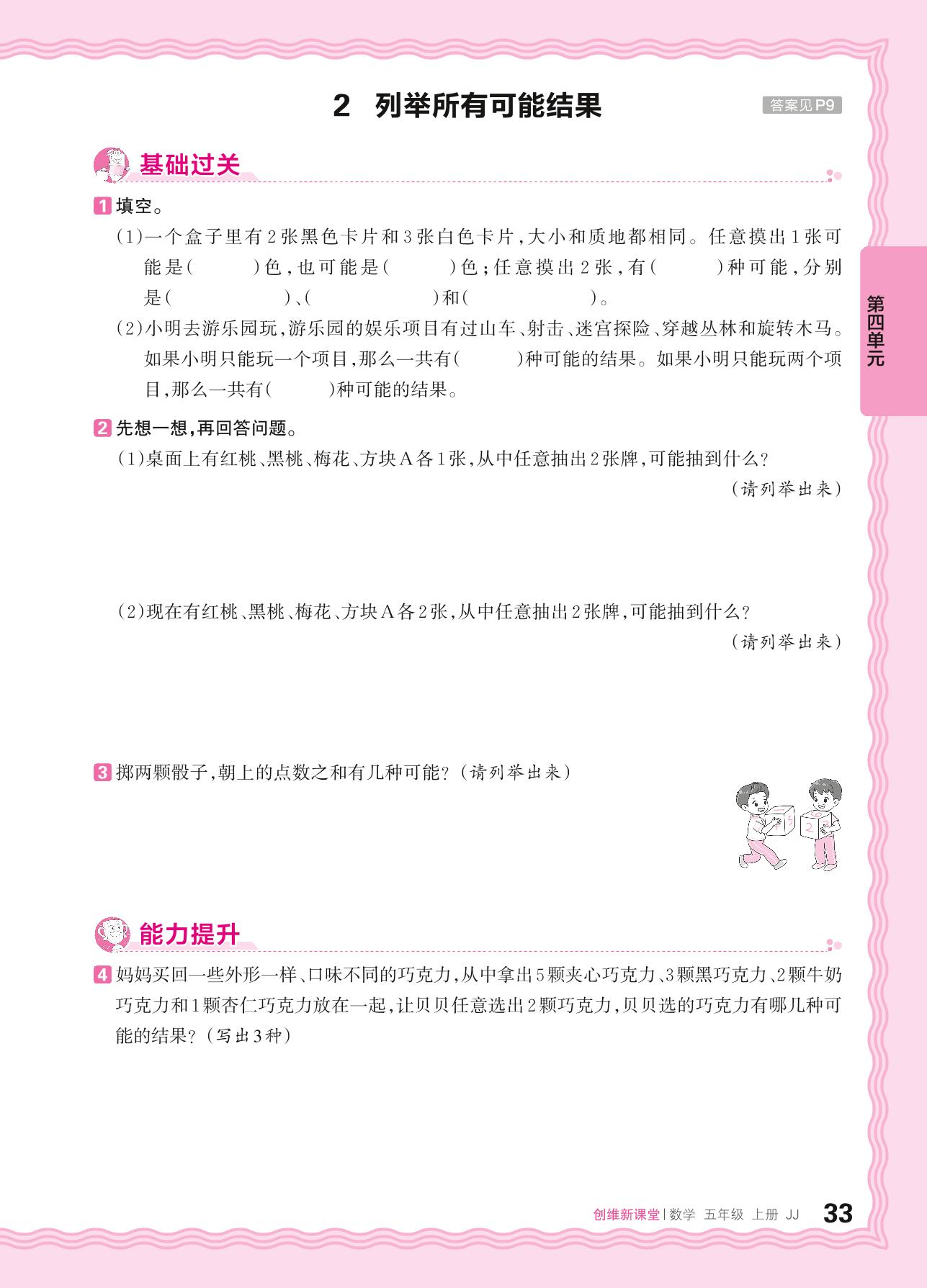 2024秋上册五年级数学冀教版 第四单元 可能性——2. 列举所有可能结果