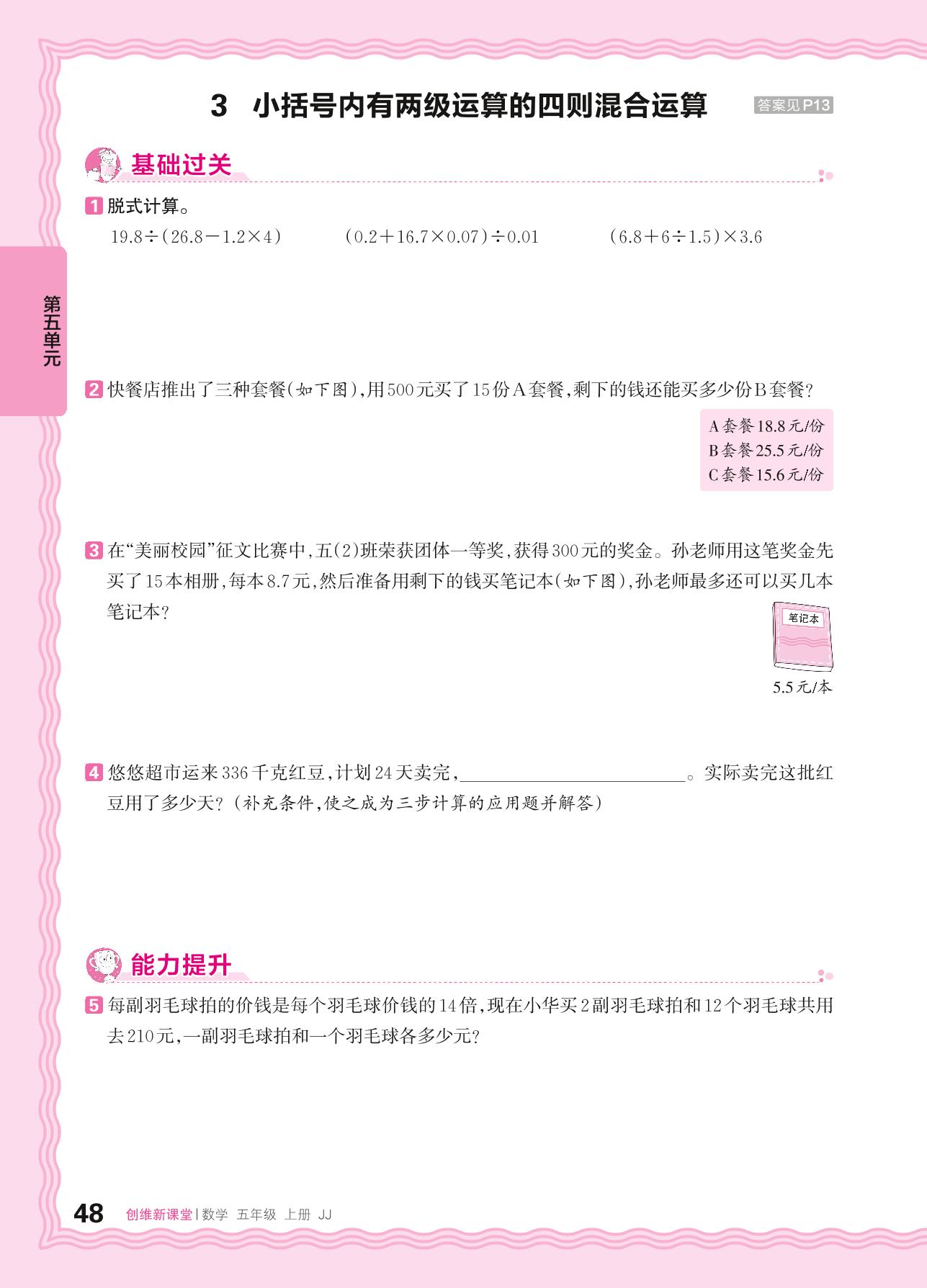 2024秋上册五年级数学冀教版 第五单元 四则混合运算(二)——3. 小括号内有两级运算的四则混合运算