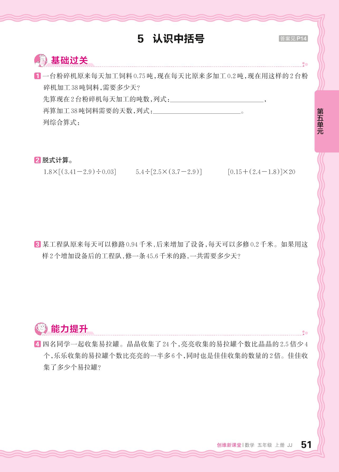 2024秋上册五年级数学冀教版 第五单元 四则混合运算(二)——5. 认识中括号