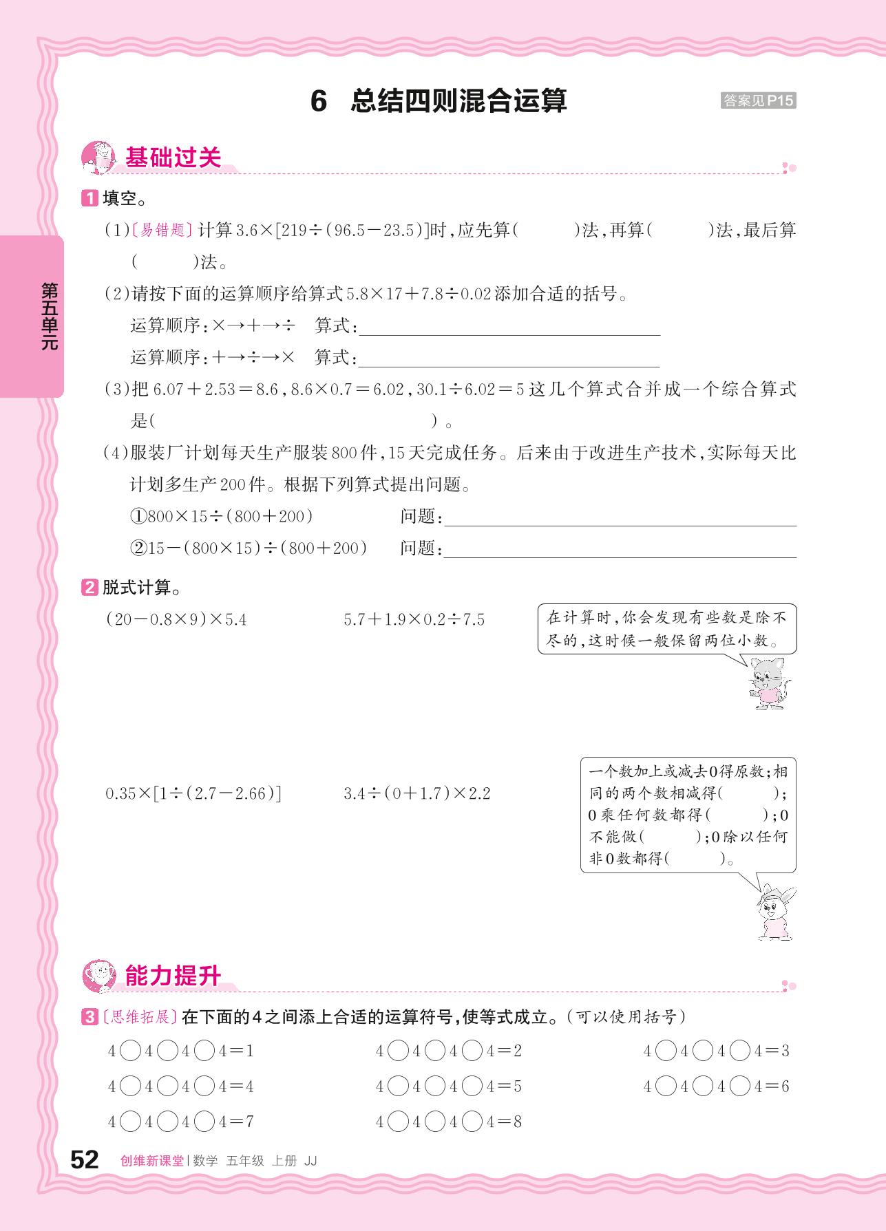 2024秋上册五年级数学冀教版 第五单元 四则混合运算(二)——6. 总结四则混合运算