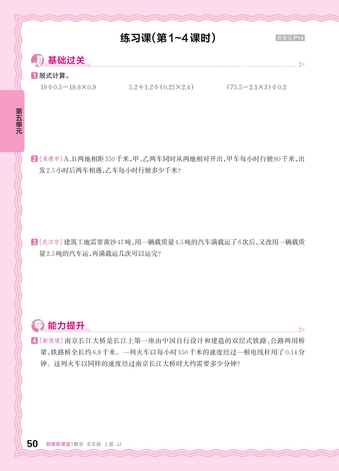 2024秋上册五年级数学冀教版 第五单元 四则混合运算(二)——相遇问题、三步四则混合运算、小括号内有两级运算的四则混合运算、多种方法解决问题练习课